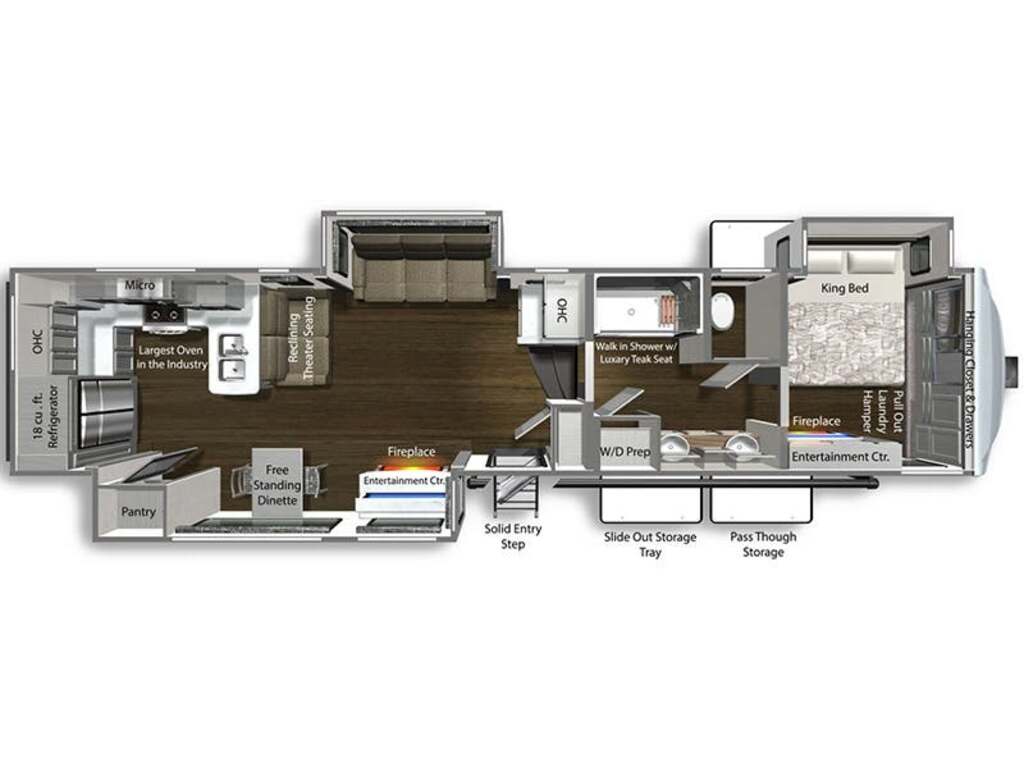 Options : Jantes aluminium, Réservoir de propane, Climatiseur conduit central, Ventilateur au plafond, Vérin stabilisateur, Roue de secours, Douche extérieure, Échelle, Attache-remorque, Douche, Toilette, Canapé-lit, Prise électrique, Cric électrique, Téléviseur, Antenne pour téléviseur, Micro-onde, Cuisinière, Four, Fourneau, Auvent, Chauffe-eau