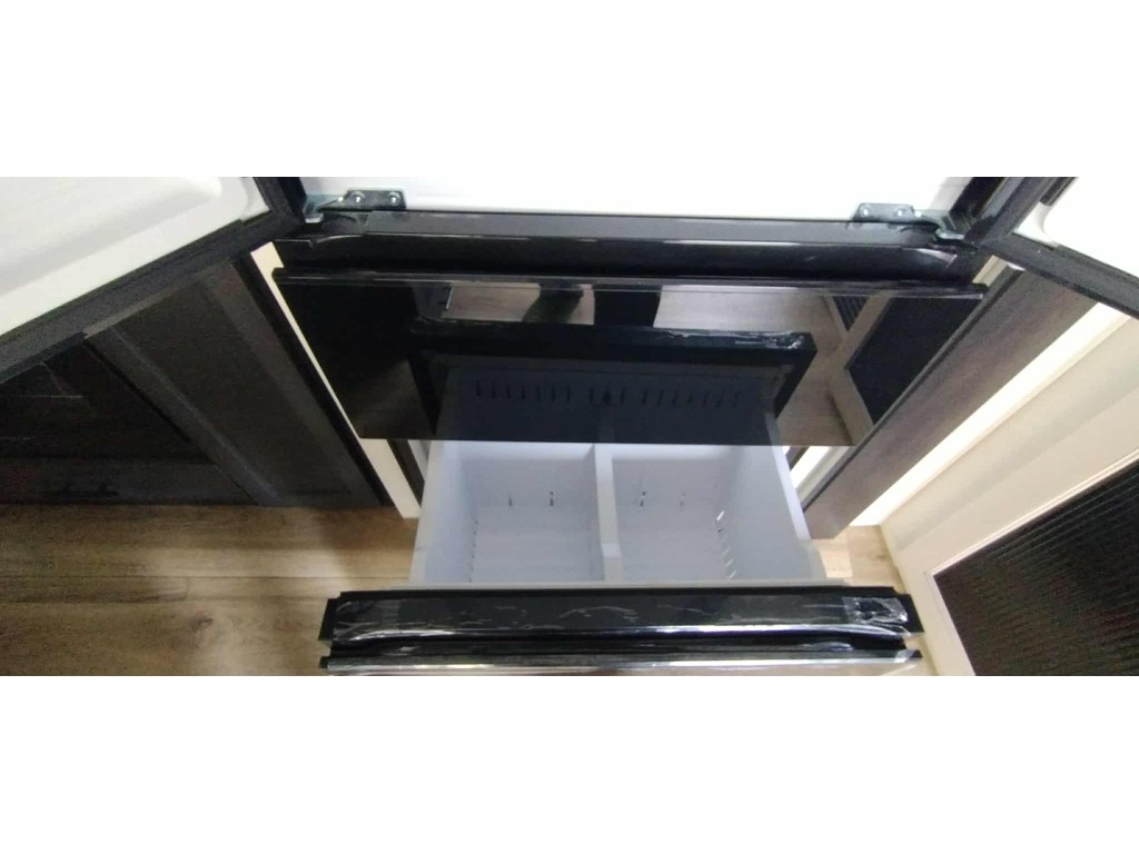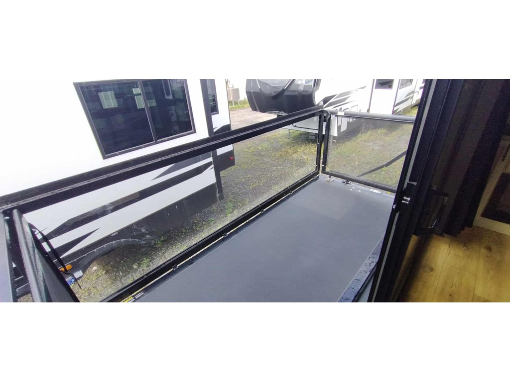Découvrez le Sabre 33RLP 2025, le cinquième roue ultime de Forest River RV, conçu pour transformer vos aventures en camping en expériences de luxe inoubliables ! Avec son design innovant incluant un Sundeck latéral exclusif qui se déploie en une terrasse extérieure spacieuse, ce modèle allie confort résidentiel et convivialité en plein air. Parfait pour les familles ou les couples en quête d'espace et de sophistication, le Sabre 33RLP offre une longueur de 39' 11" pour un agencement optimal, tout en maintenant une maniabilité exceptionnelle. Voici, point par point, les caractéristiques phares qui en font le choix promotionnel de l'année :Sundeck latéral innovant : Un patio extérieur pliable qui se transforme en grande fenêtre lorsque replié, idéal pour profiter de la nature sans quitter le confort de votre RV, avec un accès direct depuis le salon arrière. Chambre principale avant spacieuse : Lit king-size avec accès sur les trois côtés, armoires intégrées et une salle de bain luxueuse équipée d'un lavabo en porcelaine et d'un puits de lumière pour une ambiance sereine et lumineuse. Salon arrière convivial : Canapé sectionnel tri-pliable avec ottomane, cheminée électrique et centre de divertissement high-tech, parfait pour des soirées cosy pour jusqu'à 4 personnes. Cuisine bistro haut de gamme : Réfrigérateur 12V colossal à portes françaises, comptoirs en surface solide, évier de style résidentiel, micro-ondes et garde-manger éclairé avec capteur de mouvement – tout pour des repas gastronomiques en déplacement. Système de nivellement automatique électrique : Facilite l'installation en un clin d'œil, combiné à un attelage de 2 280 lbs et un poids à vide de 11 858 lbs pour une traction stable jusqu'à 14 600 lbs de PNBV. Paquet de commodité premium : Câble d'alimentation 50 ampères détachable style marine, caméra de recul et de sécurité, ventre sous-châssis chauffé avec vannes isolées, membrane de toit en PVC et auvent électrique ajustable avec éclairage LED. Paquet de confort ultime : Centre de commande central One Control avec Bluetooth, ports de charge doubles haute puissance, plancher en contreplaqué 5/8" tongue & groove et fenêtres coulissantes surdimensionnées pour une ventilation optimale. Capacités d'eau généreuses : Réservoir d'eau douce de 49 gallons, gris de 76 gallons et noir de 38 gallons, avec chauffe-eau sans réservoir pour des douches interminables. Énergie solaire intégrée : Panneau solaire de 200W Juice Pack pour une autonomie accrue, complété par des roues en aluminium avec moyeux EZ Lube et capteurs de pression des pneus pour une sécurité renforcée. Dimensions adaptées : Hauteur extérieure de 13' 5", largeur de 8' et capacité de charge utile de 2 742 lbs, pour un équilibre parfait entre espace intérieur et facilité de remorquage.