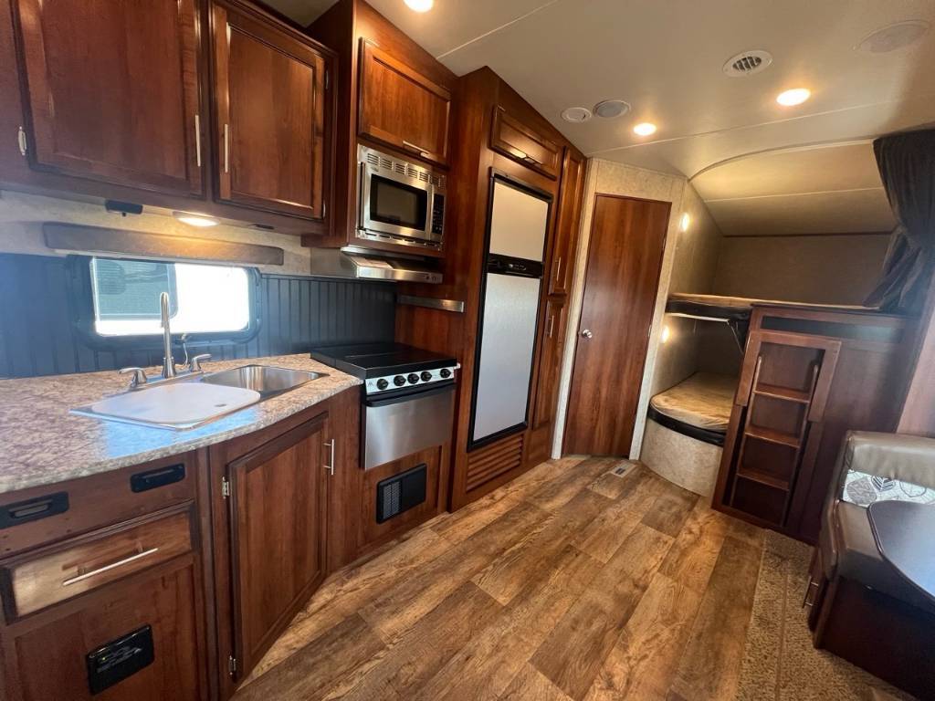 JAY FLIGHT EAGLE 265BHS 2016Longueur 31,2 pi (374 po) Largeur 8 pi (96 po) Hauteur 12,5 pi (150 po) Hauteur intérieure 6,28 pi (75,3 po) Poids Poids sec 7 280 livres Capacité de charge utile 2 670 livres Capacité de remorquage 3 000 livres PNBV 9 950 livres Poids de l'attelage 1 430 livres Réservoirs de rétention Nombre de réservoirs d'eau douce 1 Capacité totale du réservoir d'eau douce 42,0 gal. Nombre de réservoirs de rétention d'eaux grises 1 Capacité totale du réservoir d'eaux grises 32,5 gal.Longueur de l'auvent 16 pi (192 po) électrique . Nombre de réservoirs de rétention des eaux noires 1 Capacité totale du réservoir d'eaux noires 32,5 gal. Réservoir(s) de propane Nombre de réservoirs de propane 2 Capacité totale du réservoir de propane 14,2 gal. Capacité totale du réservoir de propane 60 livres. Mode d'alimentation du réfrigérateur Électrique / Propane. Nombre maximal de sommeils 10. *** Prendre note que les photos et les options décrites peuvent différées *** Toute l'équipe de Centre du VR est fière de vous présenter le plus vaste inventaire de véhicules récréatifs neufs et d'occasions à vendre au Québec. Vous y trouverez notamment les marques Columbus, Rockwood, Impression, Kodiak, Coleman, Cruiser RV, Flagstaff, E-Pro, Springdale, Sunset Trail, Cougar, Chaparral, Bontrager Outdoors, motorisés Axis, Hurricane, Outlaw, Coachmen Cross Trail, Prism, Echelon, Fleetwood, Four winds, Compass, Beyond, Nova et Pixel. Remorques N&N, Apogée et Armorteck sont aussi disponibles. En inventaire pour vous, la série de génératrices Ducar. Vous avez un coup de coeur ? Envoyez-nous une demande d'information. Financement sur place. N'oubliez pas également que rien ne vaut une visite du modèle qui vous intéresse pour vous aider à prendre une décision éclairée. Passez donc nous voir afin de jeter un coup d'oeil plus détaillé à nos caravanes et caravanes à sellettes neuves.