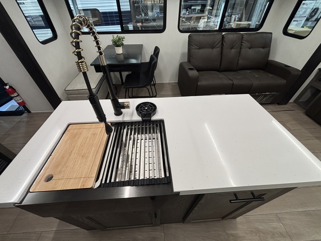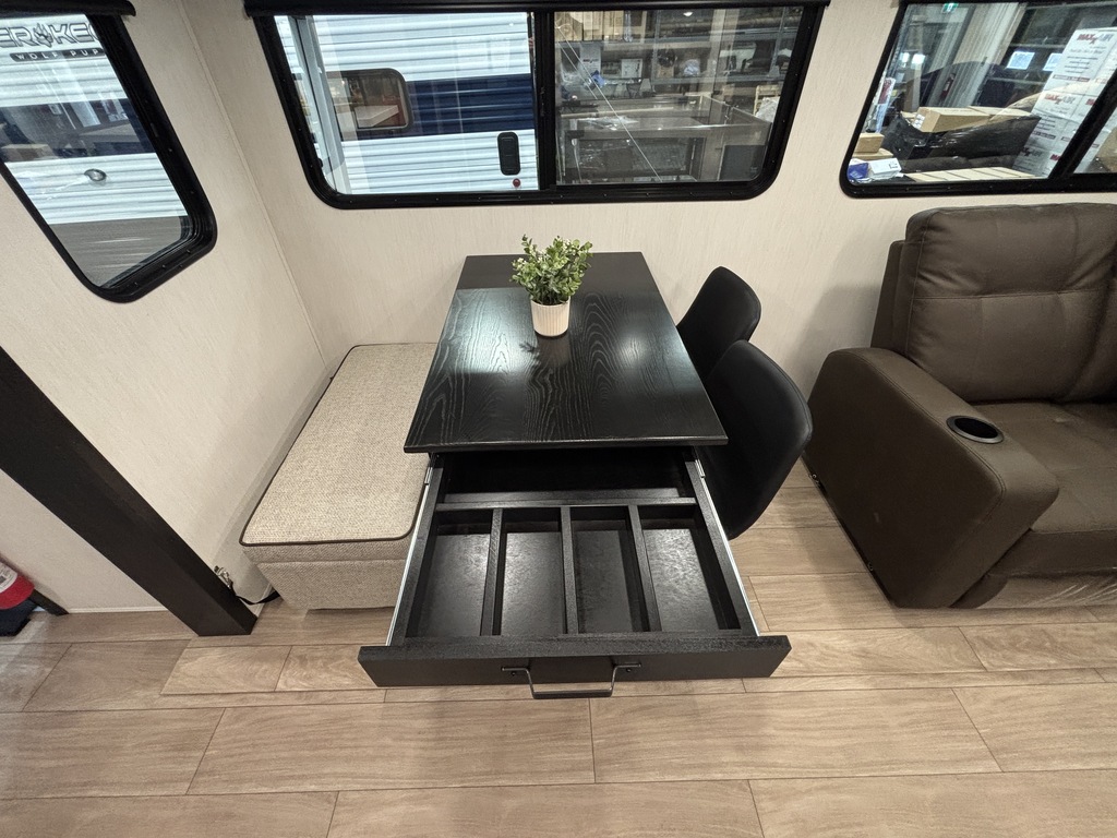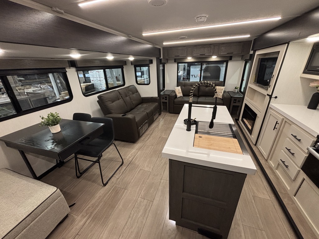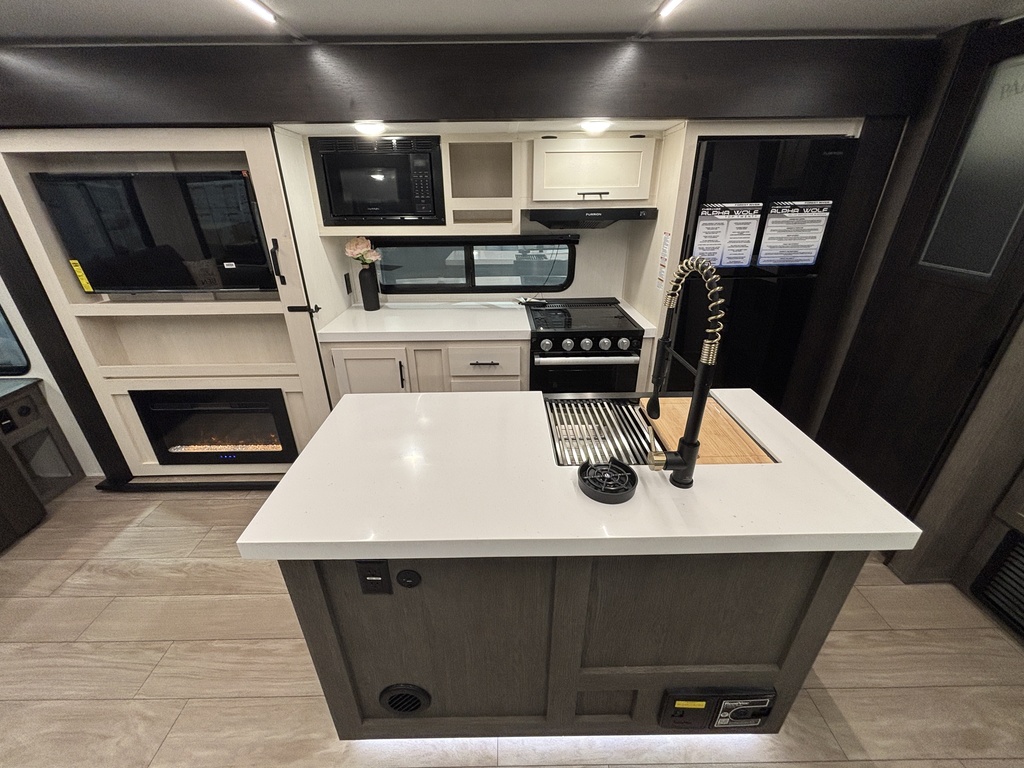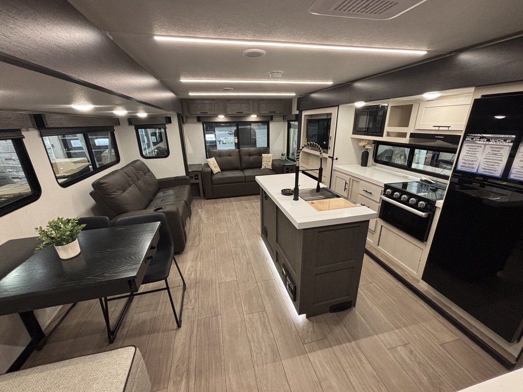 ALPHA WOLF 26RL 2026 ROULOTTE POUR COUPLE AVEC UN POIDS DE 7200 LIVRES INTÉRIEUR; - Cuisine avec îlot central muni d'un évier double - Cuisinière avec dessus vitré, micro-ondes et grand réfrigérateur - Table avec 2 chaises et une banquette qui peut aussi servir de rangement - 2 fauteuils inclinables - Sofa lit arrière avec belle fenestration tout autour - Téléviseur inclus - Foyer électrique - Lumières avec gradateur - Chambre avant avec rangement tout autour et accès direct sur la salle de bain - Salle de bain avec douche en coin et belle vanité - Système d'aspiration Roadvac qui facilite le ménage EXTÉRIEUR: - 2 auvents électrique avec lumières - Marches ultra robustes - Grands coffres de rangement - 2 extensions photos à titre indicatif