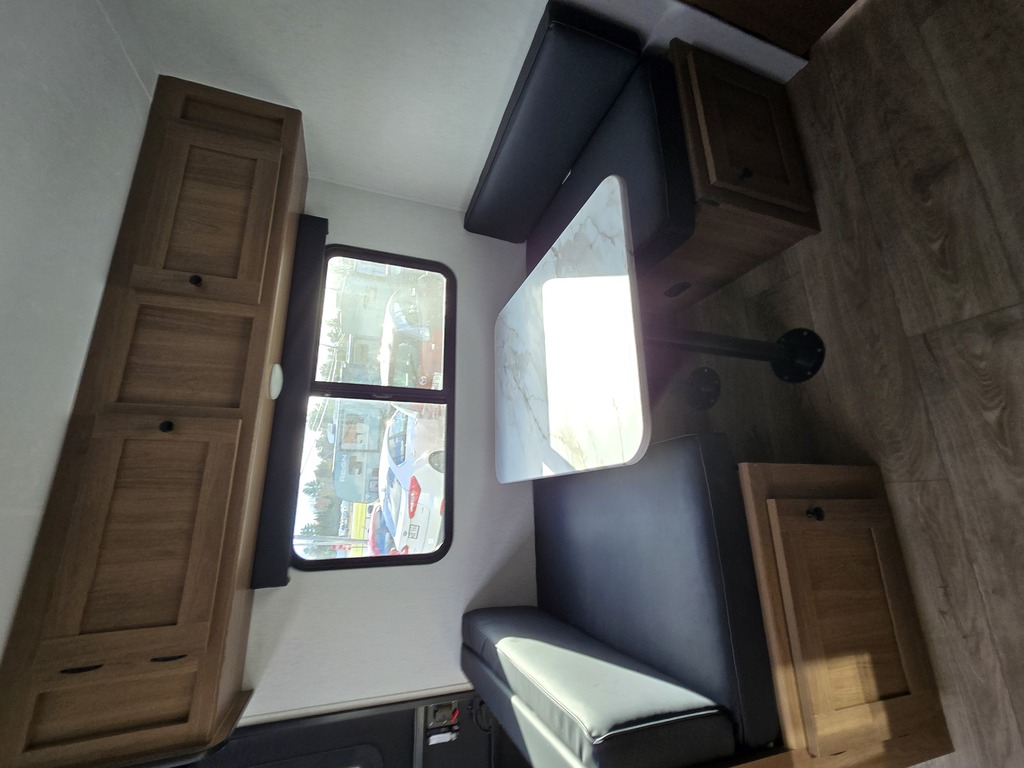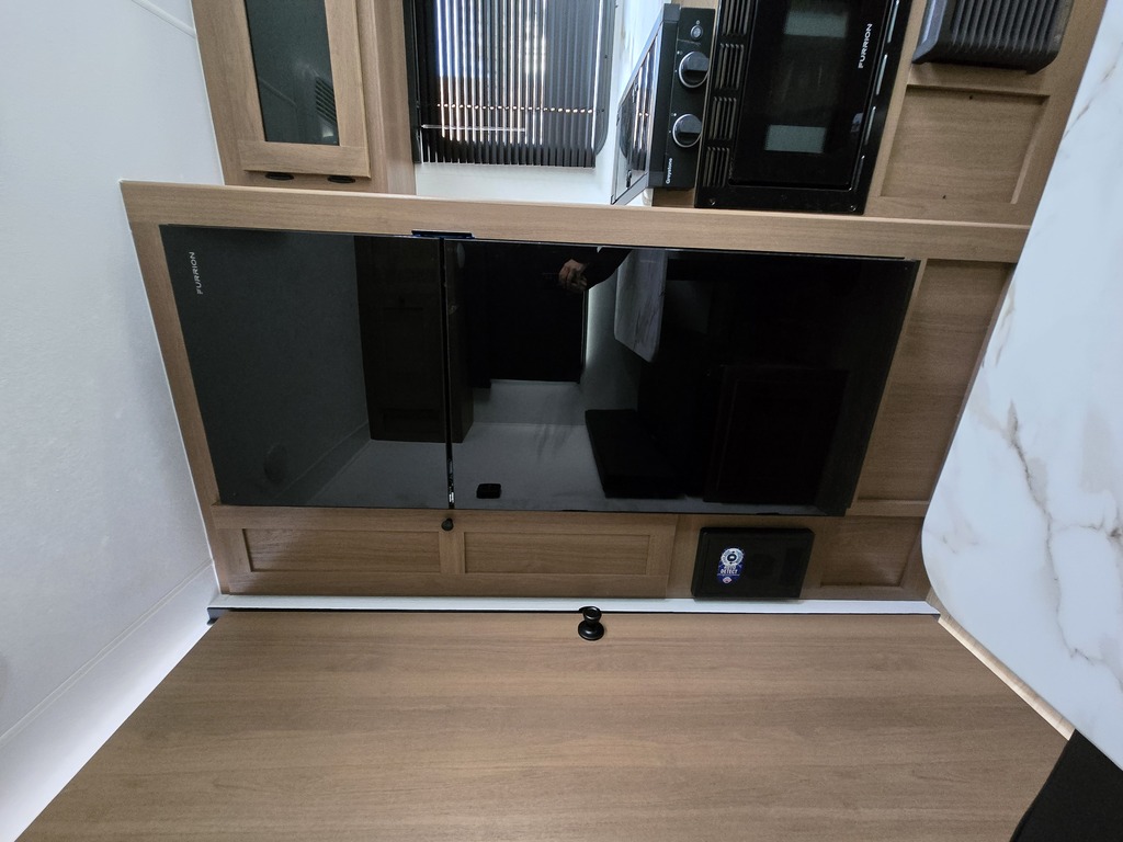 Options : Convertisseur de courant continu, Réservoir de propane, Climatiseur au plafond, Ventilateur au plafond, Vérin stabilisateur, Roue de secours, Douche extérieure, Douche, Toilette, Lit queen-size, Prise électrique, Détecteur LPG/CO2, Prise cable, Micro-onde, Auvent, Chauffe-eau à allumage direct