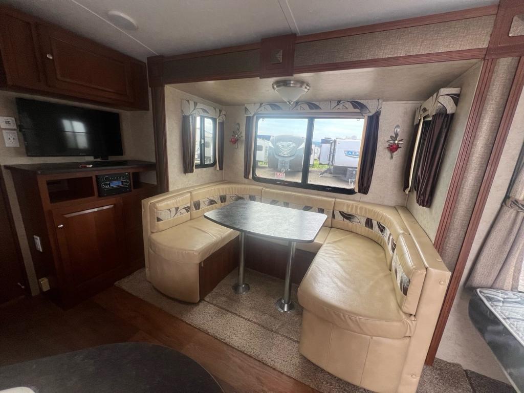 BULLET 19FBP 2014 Longueur 23,17 pi (278 po) Largeur 8 pi (96 po) Hauteur 10,92 pi (131 po) Hauteur intérieure 6,92 pi (83 po) Poids Poids sec 4 213 livres Capacité de charge utile 2 287 livres PNBV 6 500 livres Poids de l'attelage 410 livres Réservoirs de rétention Nombre de réservoirs d'eau douce 1 Capacité totale du réservoir d'eau douce 41,0 gal. Nombre de réservoirs de rétention d'eaux grises 1 Capacité totale du réservoir d'eaux grises 30,0 gal. Nombre de réservoirs de rétention des eaux noires 1 Capacité totale du réservoir d'eaux noires 30,0 gal. Réservoir(s) de propane Nombre de réservoirs de propane 2 Capacité totale du réservoir de propane 9,4 gal. Capacité totale du réservoir de propane 40 livres. Auvent rétractable électrique. Configuration de la table de cuisine Dinette en U. Mode d'alimentation du réfrigérateur Électrique / Propane . Peux coucher 4 personnes . Centre du VR : Votre expert en véhicules récréatifs au Québec Découvrez le plus vaste inventaire de VR neufs et d'occasion au meilleur prix. Que vous cherchiez une roulotte, une caravane à sellette (fifth wheel), une caravane-portée, un motorisé ou une remorque, notre équipe vous propose les plus grandes marques : Roulottes et Fifth Wheels : Rockwood, Flagstaff, Cougar, Springdale, Sunset Trail, Chaparral, Columbus, Impression, Kodiak, Coleman, E-Pro, Cruiser RV. Motorisés (Classe A, B, C) : Axis, Hurricane, Fleetwood, Four Winds, Coachmen Cross Trail, Prism, Echelon, Outlaw, Beyond, Nova. Remorques et Équipements : NN, Apogée, Armorteck et génératrices Ducar ou Cummins. Bien plus que de la vente : Un service complet Département de pièces et boutique : Un inventaire massif de pièces de remplacement et d'accessoires de camping pour améliorer votre confort. Service et réparation : Un centre de service spécialisé pour l'entretien et la réparation de vos unités, assuré par des techniciens experts. Financement : Profitez de nos solutions de financement avantageuses directement sur place. Un modèle vous intéresse ou vous avez besoin d'un entretien ? Contactez-nous pour une demande d'information ou passez nous voir en succursale pour une visite ! Note : Les photos et options peuvent différer de la réalité.