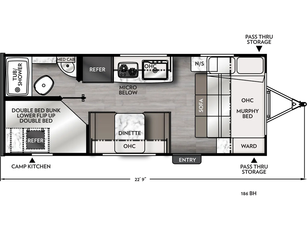 Options : Jantes aluminium, Convertisseur de courant continu, Réservoir de propane, Climatiseur au plafond, Roue de secours, Douche extérieure, Douche, Toilette, Lit queen-size, Lits superposés, Prise électrique, Détecteur LPG/CO2, Prise cable, Four à convection, Micro-onde, Cuisinière, Auvent, Chauffe-eau à allumage direct
