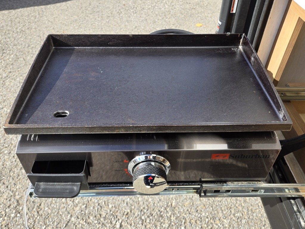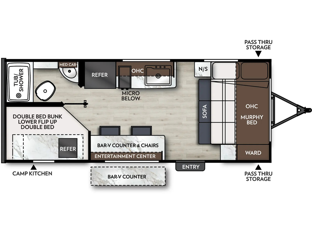 Options : Convertisseur de courant continu, Réservoir de propane, Climatiseur au plafond, Ventilateur au plafond, Vérin stabilisateur, Roue de secours, Douche extérieure, Lucarne, Douche, Toilette, Lit queen-size, Lits superposés, Prise électrique, Détecteur LPG/CO2, Téléviseur, Prise cable, Four à convection, Micro-onde, Cuisinière, Auvent, Chauffe-eau à allumage direct