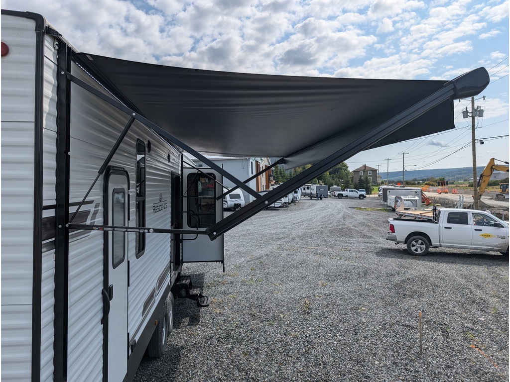 Options : Réservoir de propane, Climatiseur conduit central, Douche, Toilette, Canapé-lit, Prise électrique, Téléviseur, Micro-onde, Four, Auvent, Porte Coulissante, Chauffe-eau