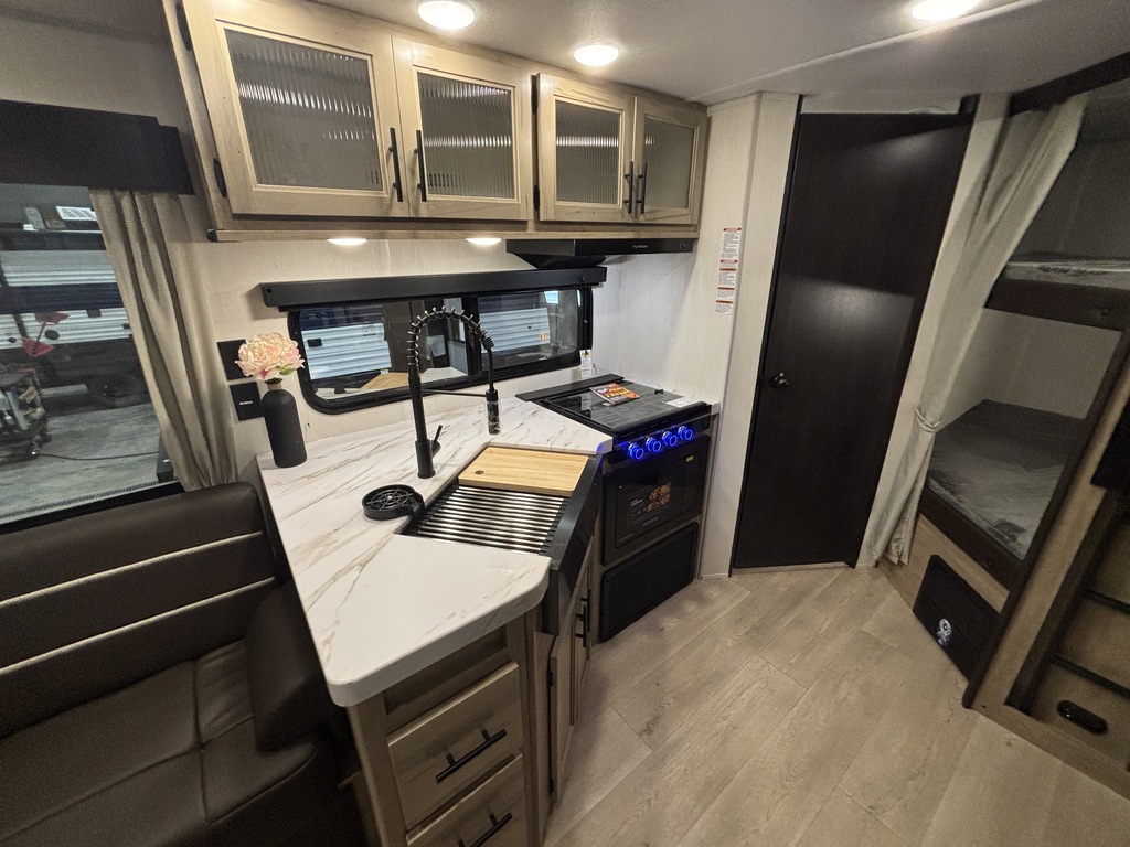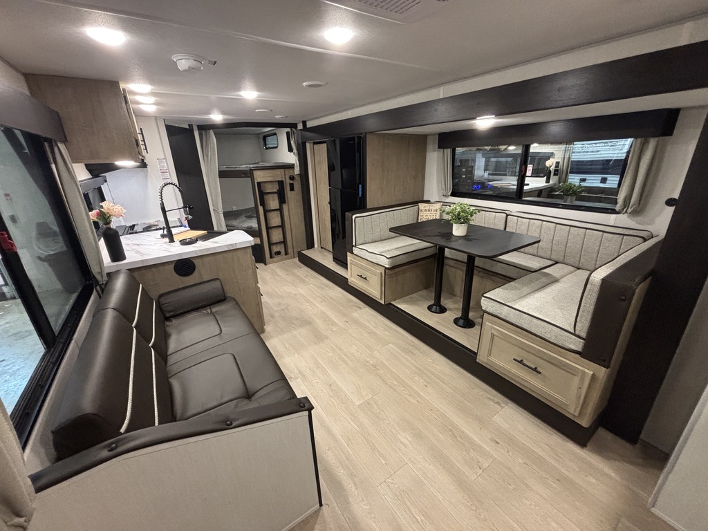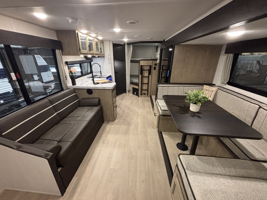 GREY WOLF 26BRB 2026 ROULOTTE FAMILIALE AVEC UN POIDS DE 6700 LIVRES INTÉRIEUR: - Belle cuisine avec évier double, 3 ronds de poêle, micro-ondes avec fonction air fryer, grand réfrigérateur ainsi qu'un grand garde-manger - Grande banquette en U qui se transforme en lit - Sofa qui se transforme en lit - Foyer électrique - Lits superposés double avec échelle - Chambre avant avec grand lit et rangement tout autour - Salle de bain arrière avec sortie indépendante EXTÉREUR: - Marches ultra robustes - Réfrigérateur extérieur, machine à glace et douchette - Coffres de rangement - Jack électrique - Auvent électrique - Rack arrière photos à titre indicatif