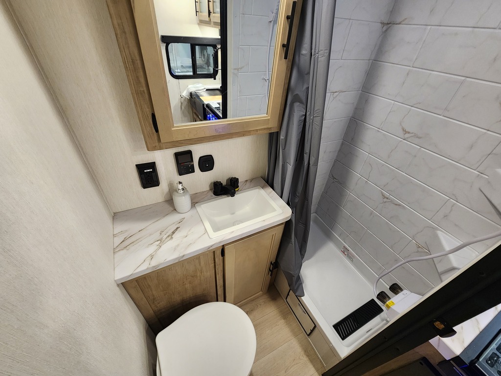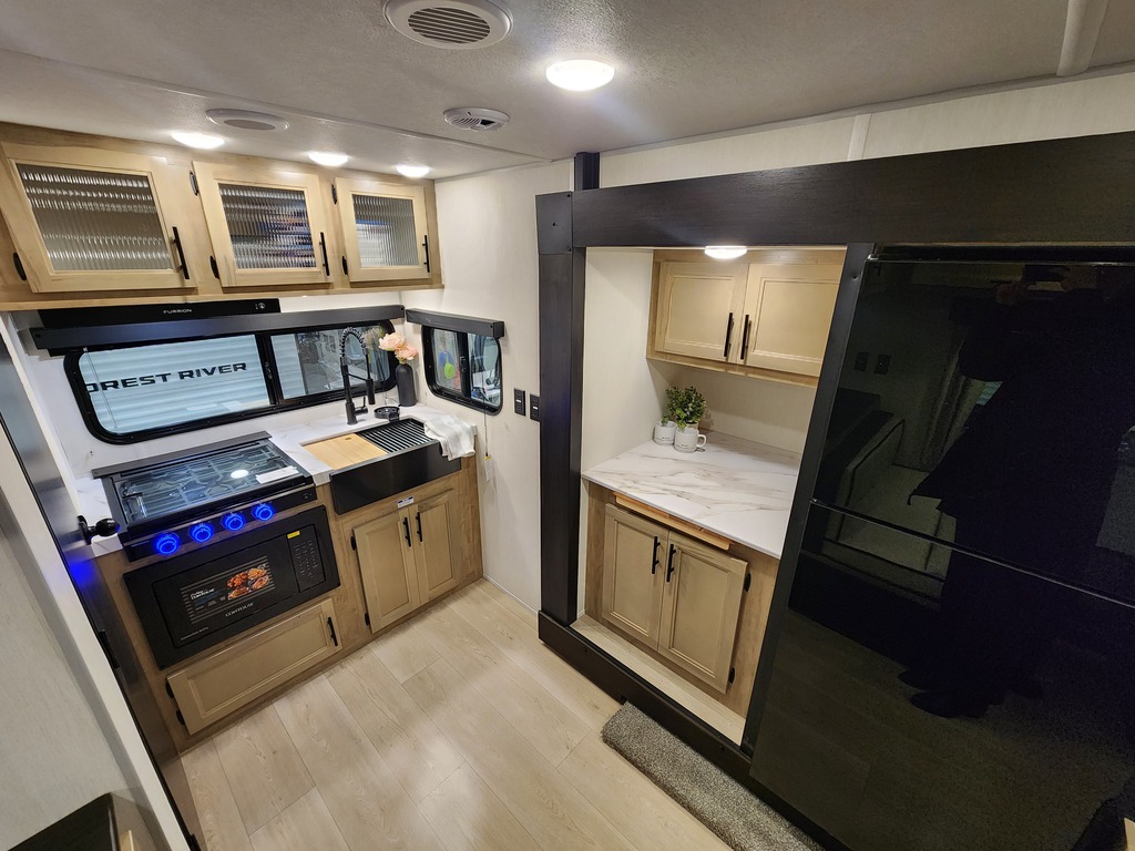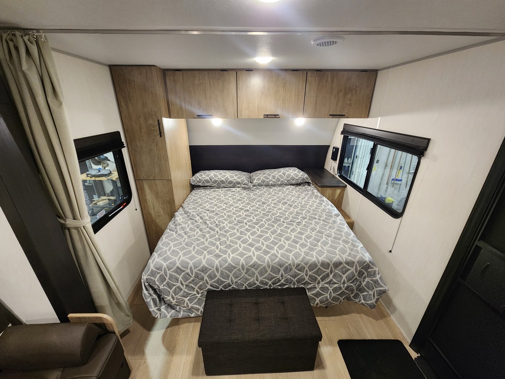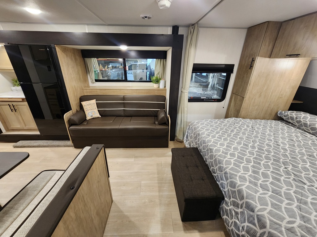 GREY WOLF 22CE 2026 ROULOTTE POUR COUPLE AVEC UN POIDS DE 5300 LIVRES INTÉRIEUR: - Cuisine arrière avec 3 ronds de poêle dessus vitré, micro-ondes convection airfryer, evier et grand réfrigérateur - Petit coin café avec rangement et extension de comptoir - Banquette double à côté d'une belle fenestration - Grand lit avant avec rangement tout autour - Sofa qui se transforme en lit - Salle de bain arrière avec douche et vanité EXTÉRIEUR: - Auvent électrique avec lumières - Marches robustes - Coffre de rangement - Jack électrique - Rack arrière photos à titre indicatif