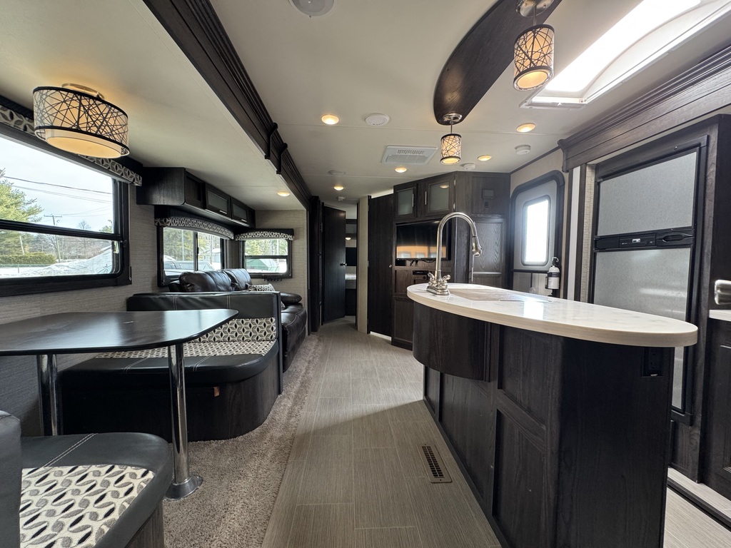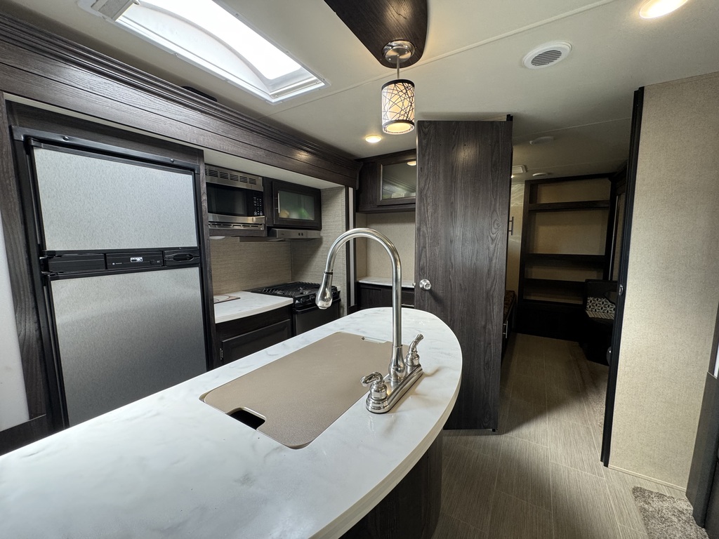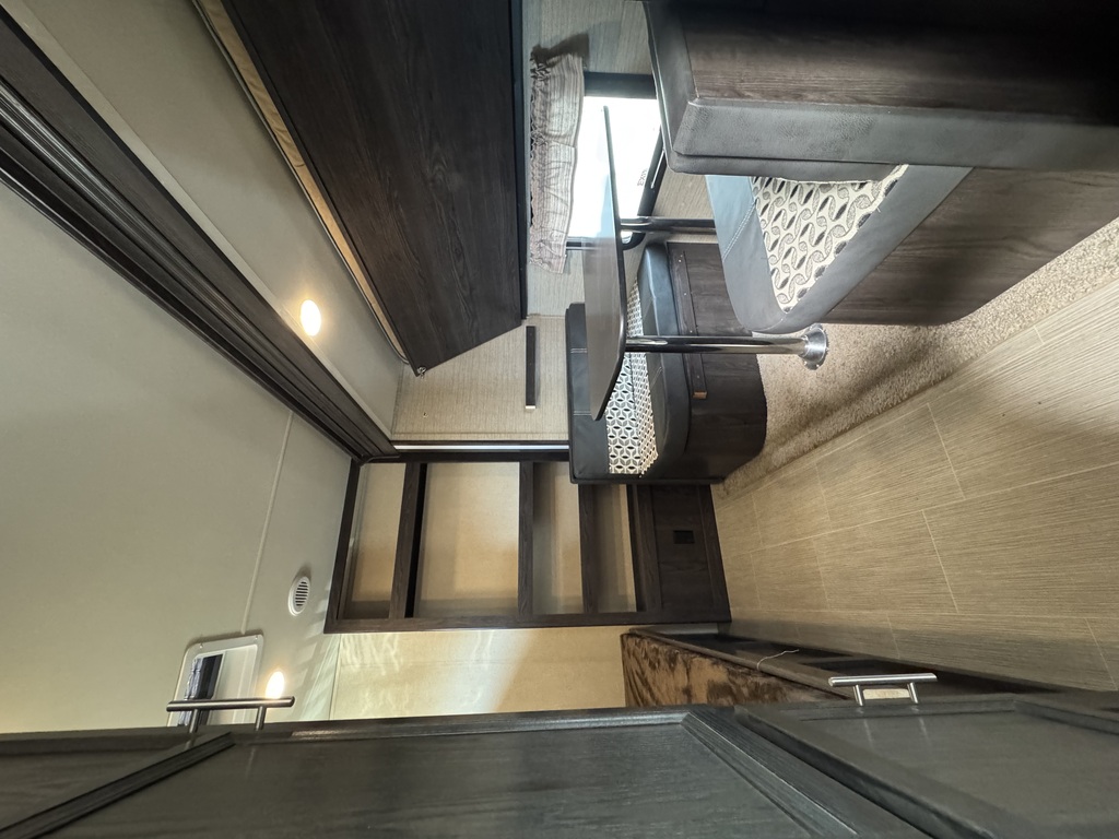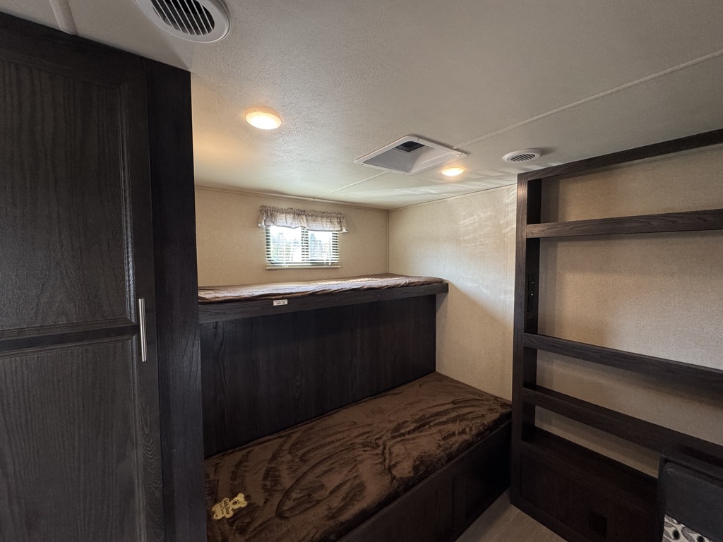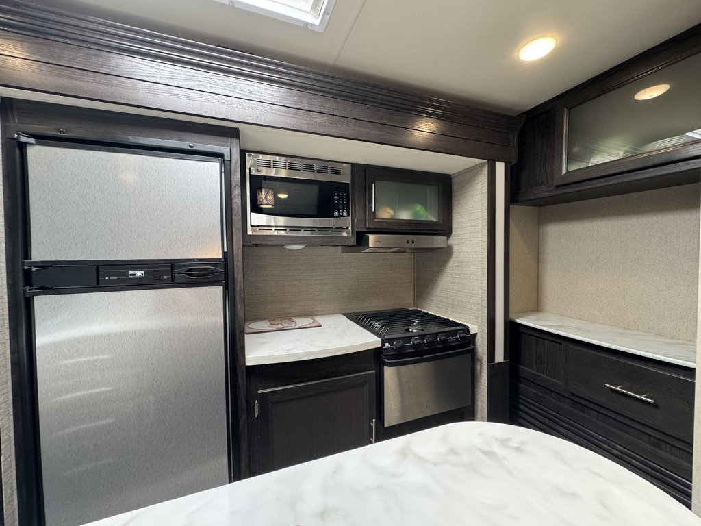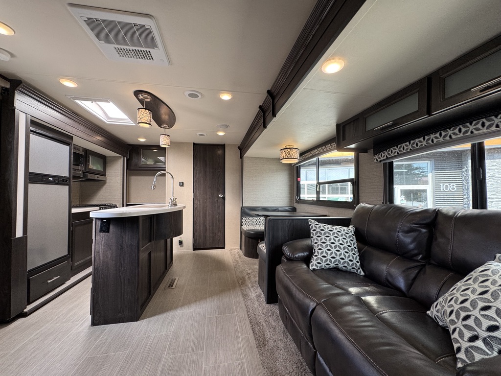 Options : Réservoir de propane, Climatiseur conduit central, Vérin stabilisateur, Douche, Toilette, Lit queen-size, Lits superposés, Détecteur LPG/CO2, Micro-onde, Four, Hotte, Auvent, Chauffe-eau