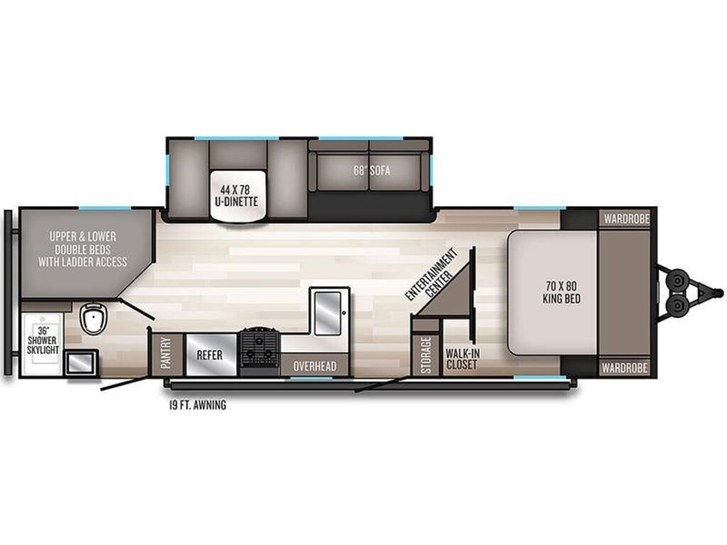 Options : Climatiseur au plafond, Douche, Toilette, Lit queen-size, Lits superposés, Détecteur LPG/CO2, Chaine stéréo, Micro-onde, Cuisinière, Four, Hotte, Auvent, Chauffe-eau, Lecteur DVD, Couchette