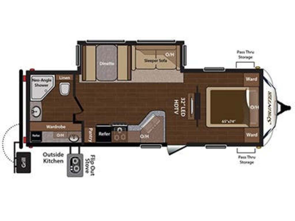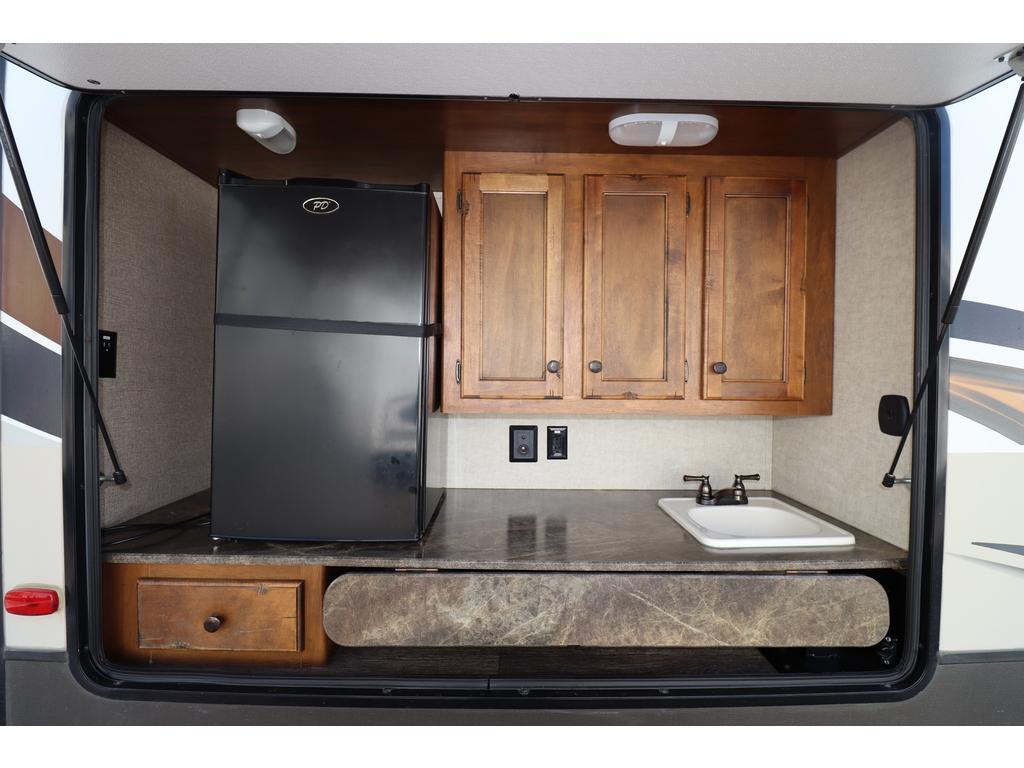 Options : Réservoir de propane, Climatiseur au plafond, Ventilateur au plafond, Vérin stabilisateur, Douche, Toilette, Lit queen-size, Canapé-lit, Prise électrique, Détecteur LPG/CO2, Téléviseur, Chaine stéréo, Prise cable, Micro-onde, Cuisinière, Four, Hotte, Fourneau, Auvent, Chauffe-eau