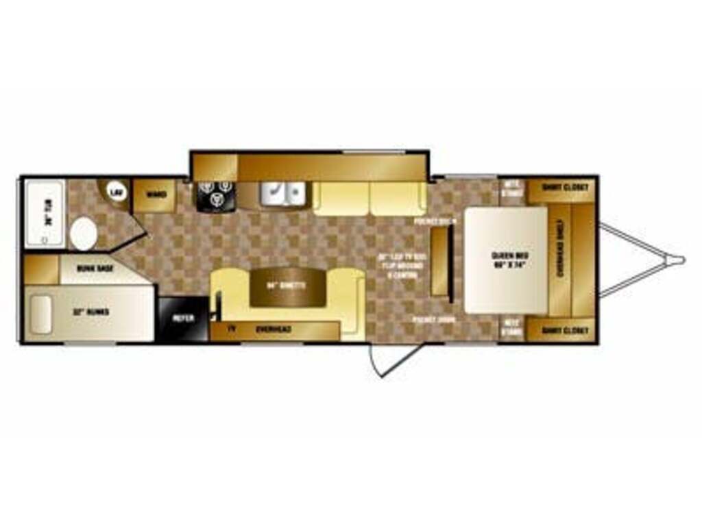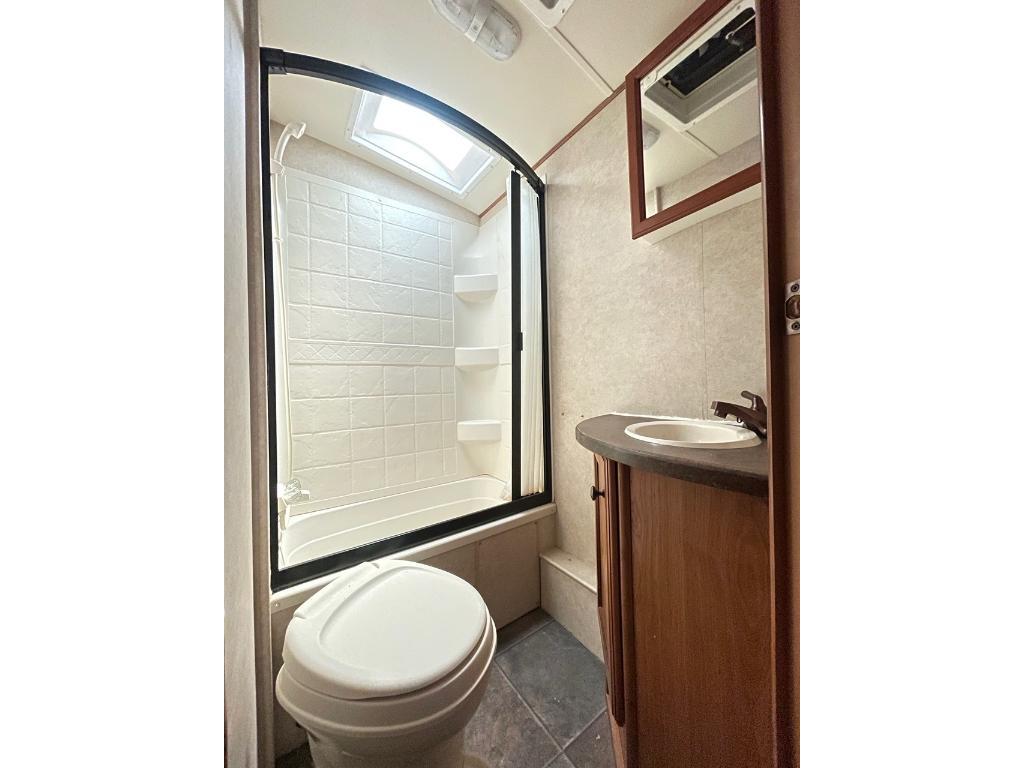 Options : Réservoir de propane, Climatiseur au plafond, Vérin stabilisateur, Douche extérieure, Toilette, Lit queen-size, Lit double, Prise électrique, Détecteur LPG/CO2, Téléviseur, Chaine stéréo, Micro-onde, Cuisinière, Four, Hotte, Fourneau, Auvent