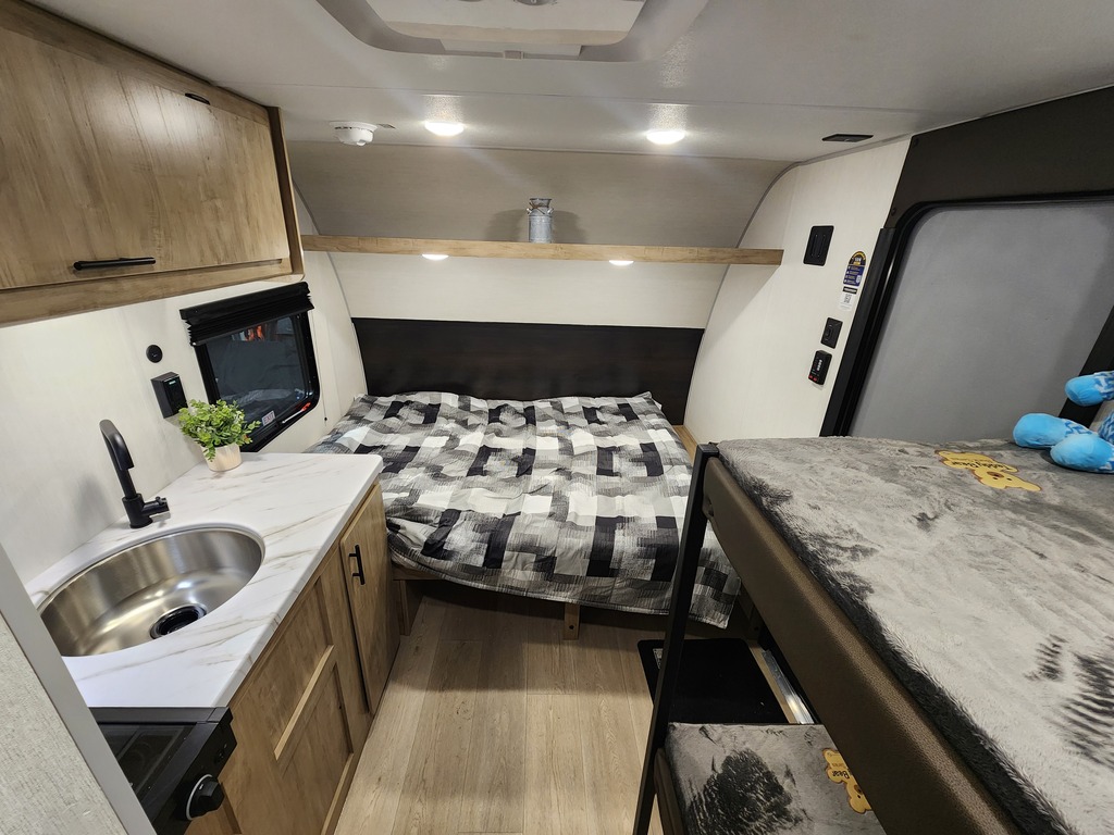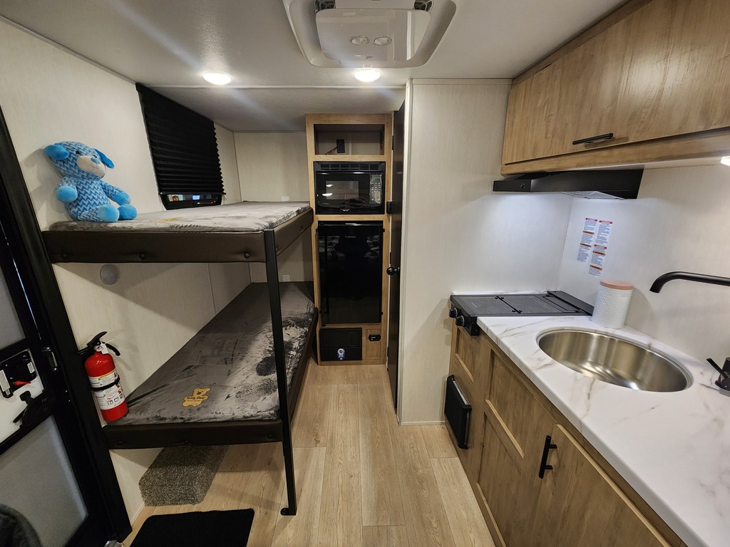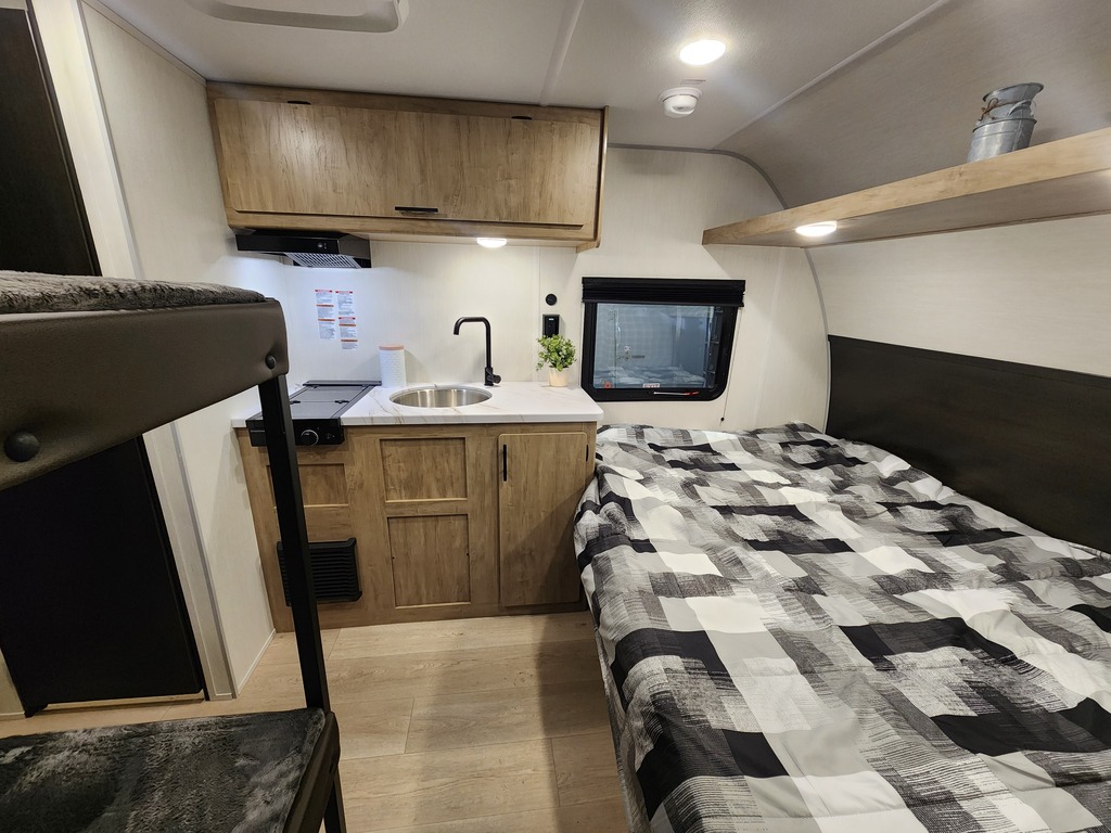 PETITE ROULOTTE LÉGÈRE WOLF PUP 14BHLP 2026 Elle pèse seulement 2600 lbs. Elle peut coucher jusqu'à 4 personnes. INTÉRIEUR: - Cuisine tout équipée avec évier, micro-onde, ronds de poêle et réfrigérateur. - Lits superposés simples - Salle de bain avec bain douche EXTÉRIEUR: - Auvent électrique - Coffre de rangement à l'avant sous le lit Parfaite pour partir à l'aventure avec un VUS ! *Photo à titre indicatif*