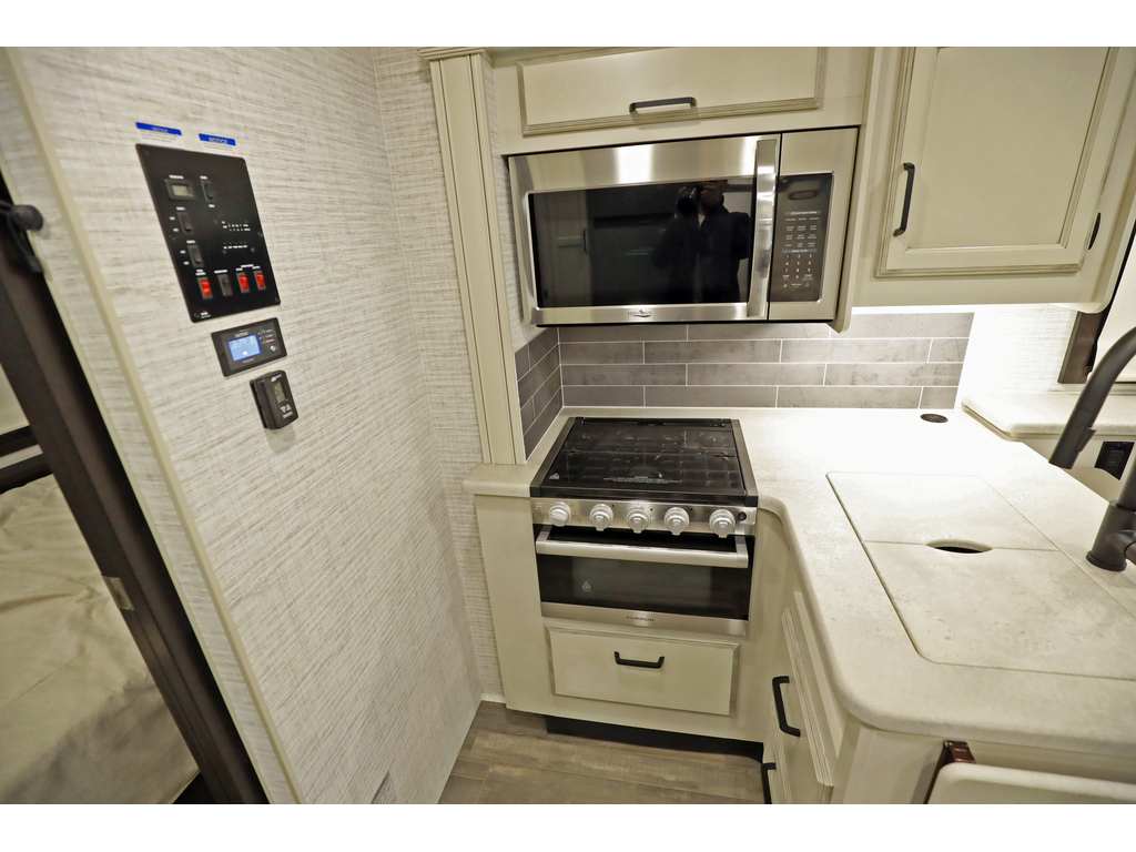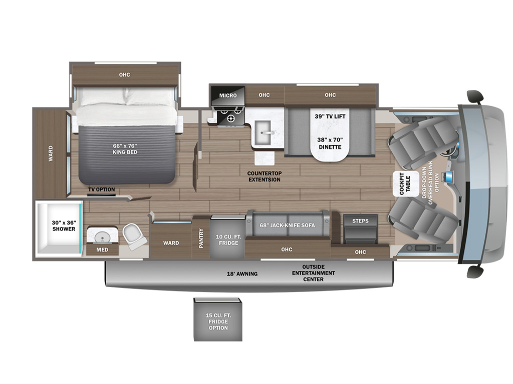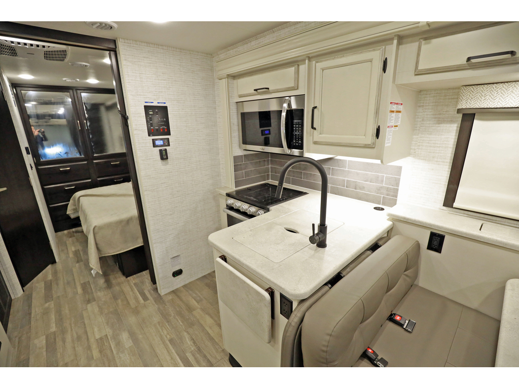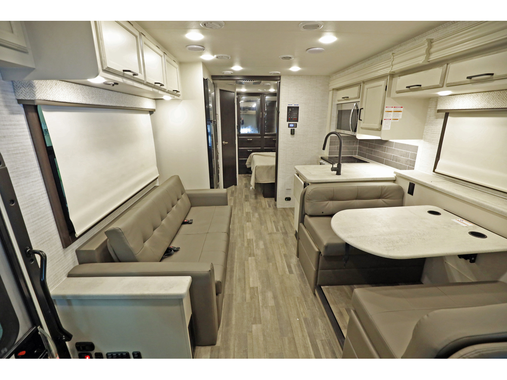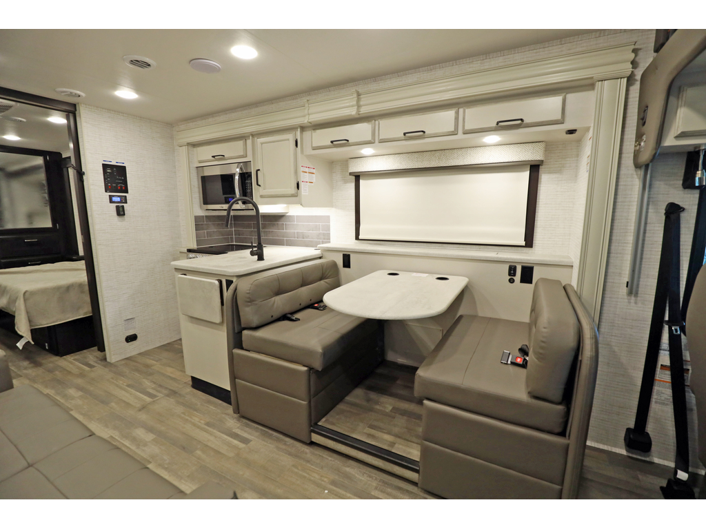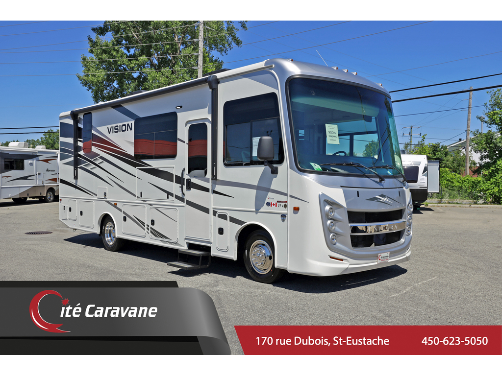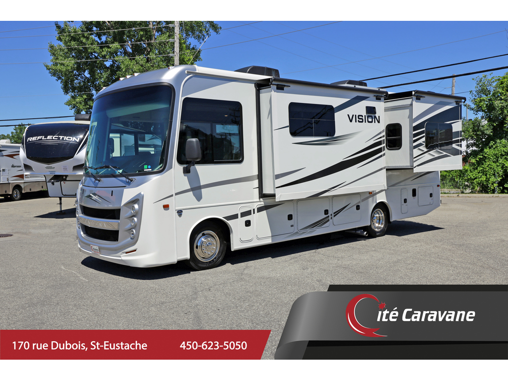 Entegra Vision 27A 2 extension , lumières LED améliorées sous le comptoir et au-dessus du fascia, profil de caméra de vue arrière , . Ce magnifique VR comprend 2 extensions, un lit king size, un aménagement confortable et spacieux, des vérins de nivellement hydrauliques automatiques, un châssis Ford F53. Ce véhicule de plaisance étonnant comprend un ensemble valeur client qui comprend des caméras de recul et de vue latérale, un auvent électrique avec lumières LED, un centre de divertissement extérieur avec TV et DVD / radio, un système d'infodivertissement, une télévision LED dans le salon, des stores à rouleau, un toit en fibre de verre couronné sans couture et auvents à couvercle coulissant. L'équipement en option comprend une couchette avant. La liste impressionnante de caractéristiques standard de la Vision qui le distingue vraiment de la concurrence comprend la garantie inégalée de 2 ans d'Entegra, un cap avant en fibre de verre d'une seule pièce, un pare-brise panoramique avec pare-brise électrique, un toit en fibre de verre couronné sans couture, un roulement à billes guides de tiroirs, grande douche et bien plus encore Entegra Vision 27A 2 slides New exterior graphics package, bed outlets added to inverter, upgraded LED lights below countertop and above fascia, upgraded sleeker rear view camera profile, new hardwood fascia, and all theater seating has been upgraded to a center console with cup holders. This beautiful RV features 2 slide-out rooms, king size bed, a comfortable, spacious layout, automatic hydraulic leveling jacks, Ford F53 chassis. This amazing RV boasts Customer Value Package which features backup & side-view cameras with monitor, electric awning with LED lights, exterior entertainment center with TV & DVD/radio, infotainment system, LED TV in living room, roller shades, seamless crowned fiberglass roof and slide-out cover awnings. Optional equipment includes a front overhead bunk. The Vision's impressive list of standard features that truly set it apart from the competition include Entegra's unparalleled 2 year warranty, one-piece fiberglass front cap, panoramic windshield with power shade , seamless crowned fiberglass roof, ball-bearing drawer guides, large shower and much more