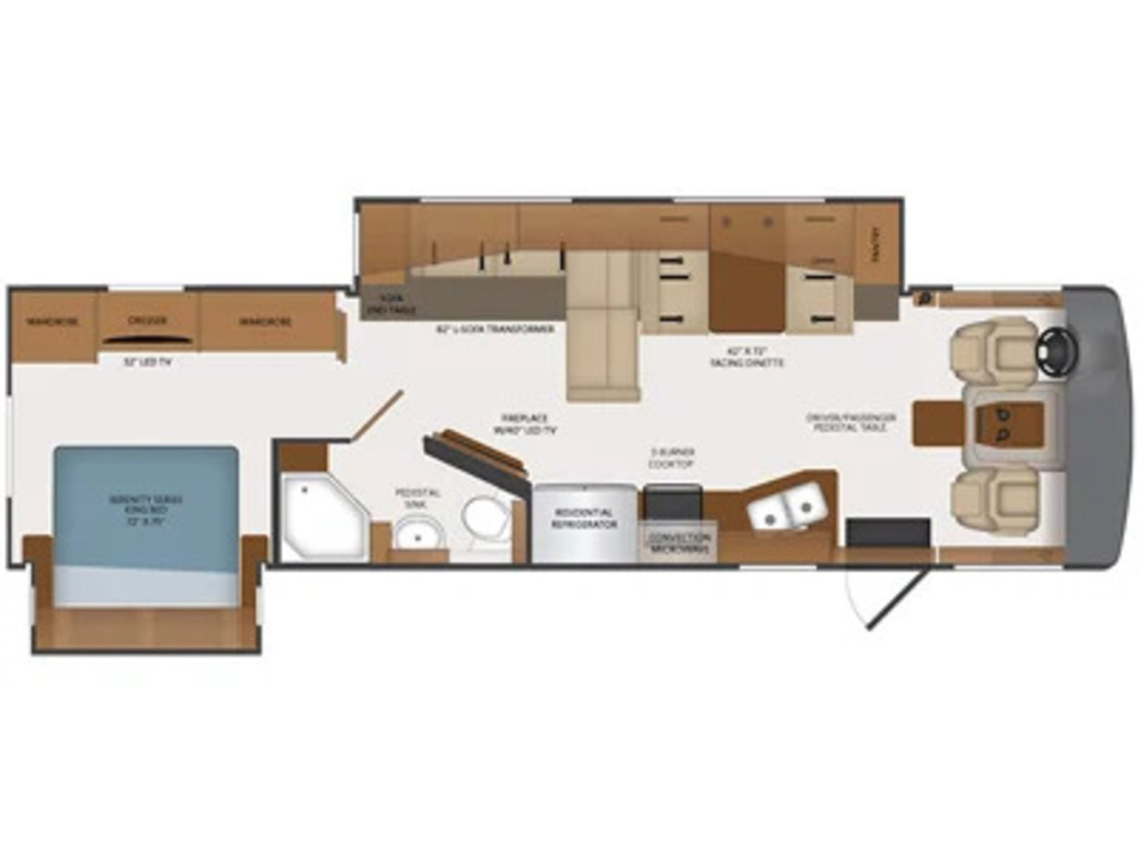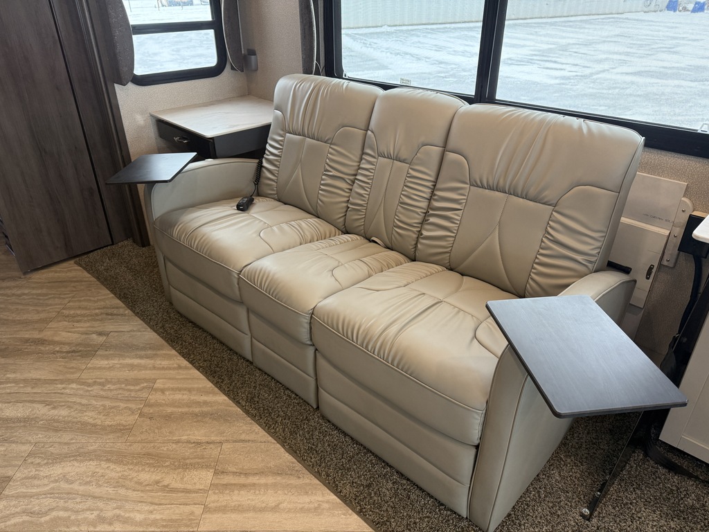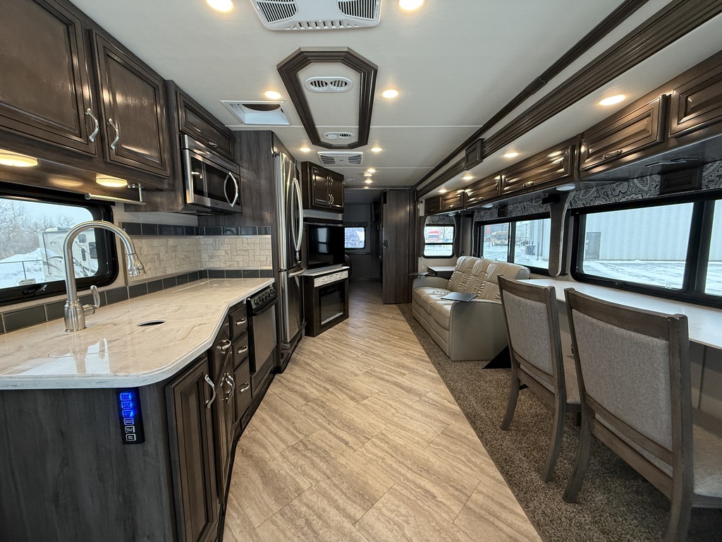 Options : Jantes aluminium, Génératrice à essence, Réservoir de propane, Climatiseur au tableau de bord, Climatiseur conduit central, Régulateur de vitesse, Volant inclinable, Cric hydraulique, Douche extérieure, Échelle, Attache-remorque, Douche, Toilette, Laveuse, Sécheuse, Lit queen-size, Prise électrique, Téléviseur, Micro-onde, Cuisinière, Four, Fourneau, Auvent, Chauffe-eau