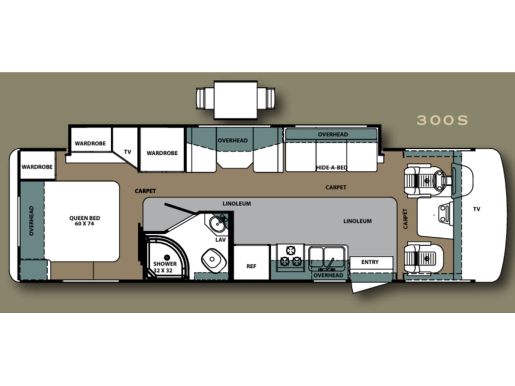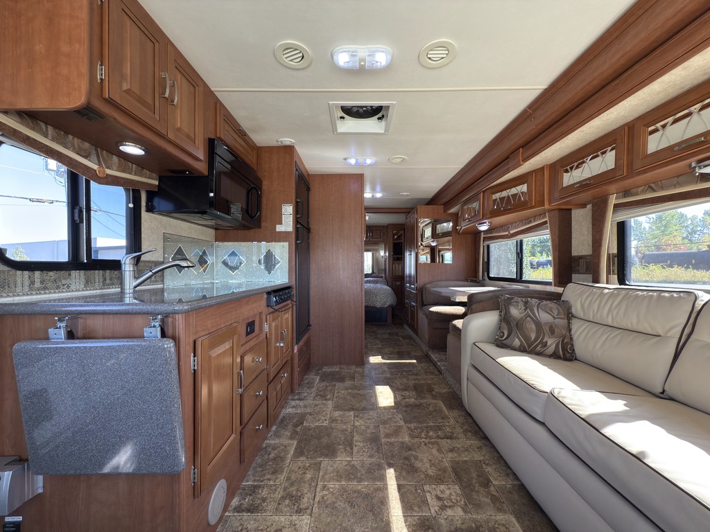 Options : Génératrice à essence, Réservoir de propane, Climatiseur conduit central, Miroirs électriques, Régulateur de vitesse, Volant inclinable, Caméra Marche arrière, Cric hydraulique, Échelle, Attache-remorque, Douche, Toilette, Lit queen-size, Canapé-lit, Téléviseur, Micro-onde, Cuisinière, Auvent, Chauffe-eau