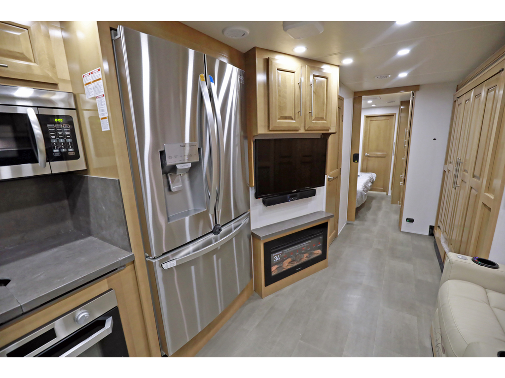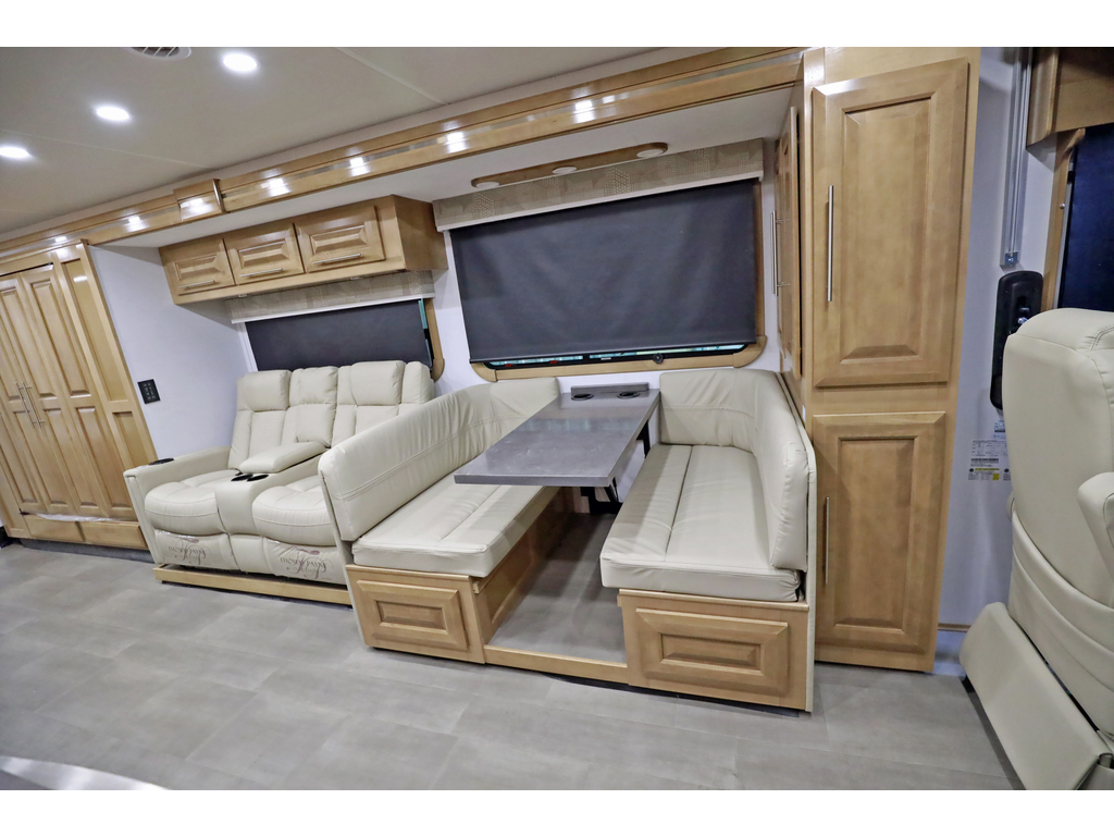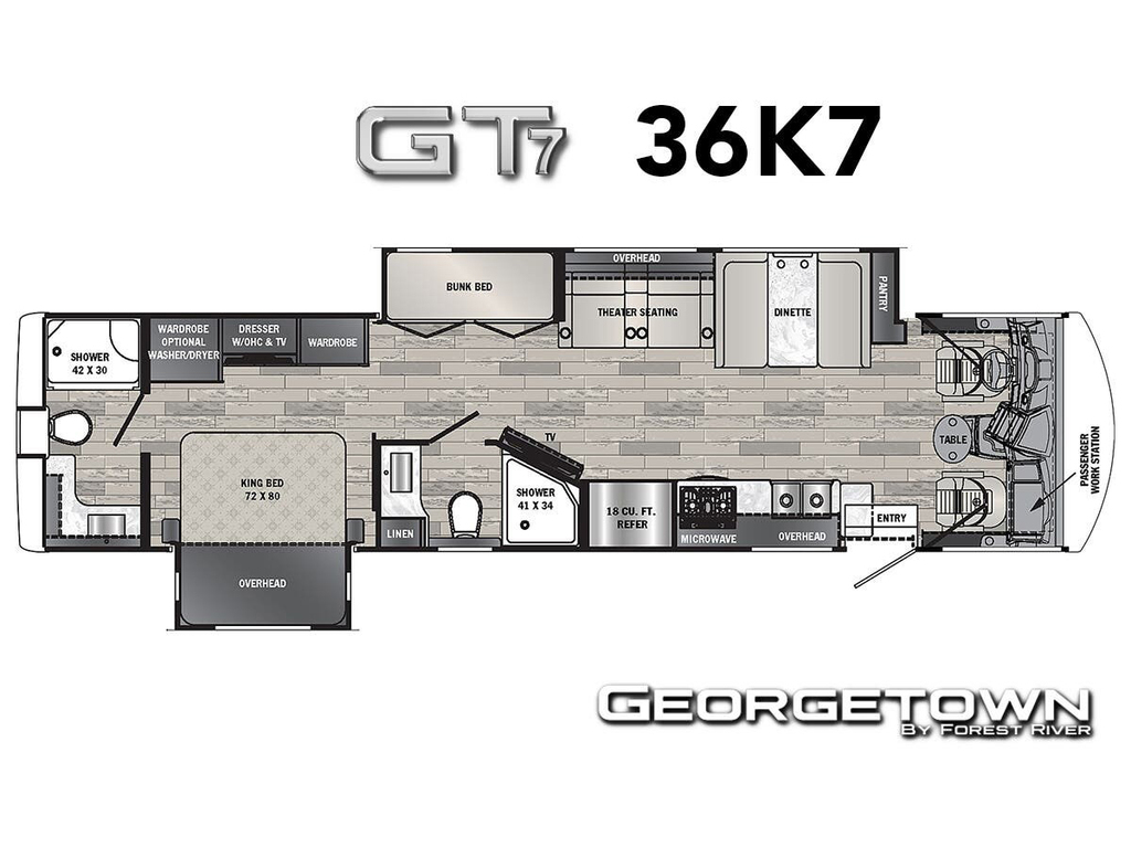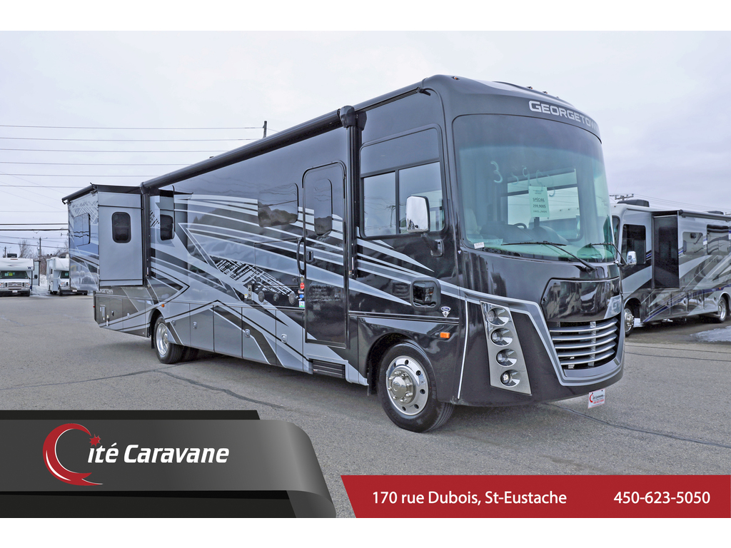 disponible sur commande - available on order Forest River Georgetown GT7 Modèle 36K7 Ce véhicule récréatif Classe A comprend des sièges de théâtre, 2 extensions , un lit king-size, 2 A / C et un réfrigérateur résidentiel. Ce magnifique nouveau camping-car comprend également le nouveau châssis Ford avec 7,3 L PFI V-8, 350 CV, 468 lb-pi. moteur couple, une transmission automatique TorqShift® à 6 vitesses, un combiné d'instruments mis à jour, des phares automatiques et un volant inclinable / télescopique. L'équipement en option comprend la magnifique peinture corporelle complète, les fenêtres à double vitrage, entrée pour laveuse / sécheuse empilables. Le Forest River Georgetown comprend également des roues en aluminium, un générateur 7KW, un onduleur 2000w, des réservoirs de rétention chauffés, une fenêtre pour chien dans le cockpit, un loft électrique P2K, une grande télévision LED de salon, des sièges de cinéma électriques, une télévision LED de chambre à coucher, des comptoirs en surface solide, un micro-ondes à convection, Panneau de système multiplex, système de nivellement hydraulique et bien plus encore! www.citecaravane.com 450-623-5050 170 rue dubois, St-eustache J7P 4W9 Forest River Georgetown GT7 Model 36K7 This RV Class A featuring theater seating, 2 slide-out , king bed, 2 A/Cs and a residential refrigerator. This beautiful new motorhome also features the new Ford chassis with 7.3L PFI V-8, 350HP, 468 ft. lbs. torque engine, a 6-speed TorqShift® automatic transmission, an updated instrument cluster, automatic headlights and a tilt/telescoping steering wheel. Optional equipment includes the beautiful full body paint, dual pane windows, stackable washer/dryer preperation. The Forest River Georgetown also features aluminum wheels, 7KW generator, 2000w inverter, heated holding tanks, doggy window in cockpit, P2K power overhead loft, large LED living room TV, power theater seats, bedroom LED TV, solid surface countertops, convection microwave, Multiplex system panel, hydraulic leveling system and much more ! www.citecaravane.com 450-623-5050 170 rue dubois , St-eustache J7P 4W9