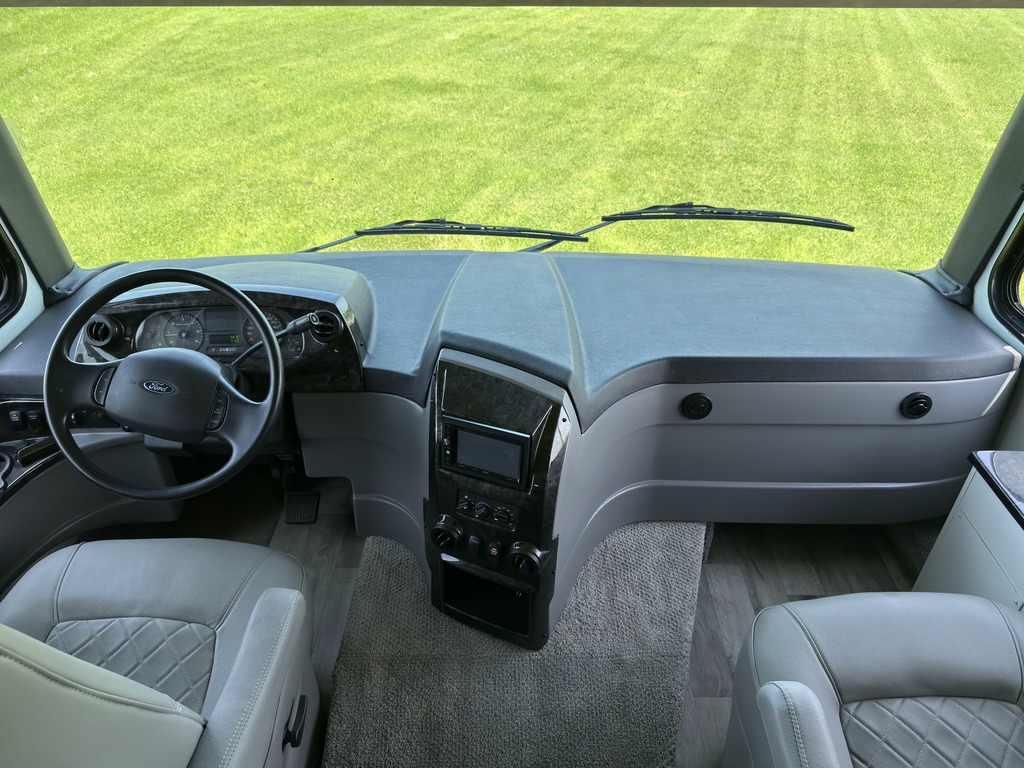 Options : Génératrice à essence, Réservoir de propane, Climatiseur conduit central, Miroirs électriques, Régulateur de vitesse, Volant inclinable, Caméra Marche arrière, Cric hydraulique, Attache-remorque, Toilette, Lit queen-size, Téléviseur, Antenne pour téléviseur, Micro-onde, Cuisinière, Four, Fourneau, Auvent, Chauffe-eau