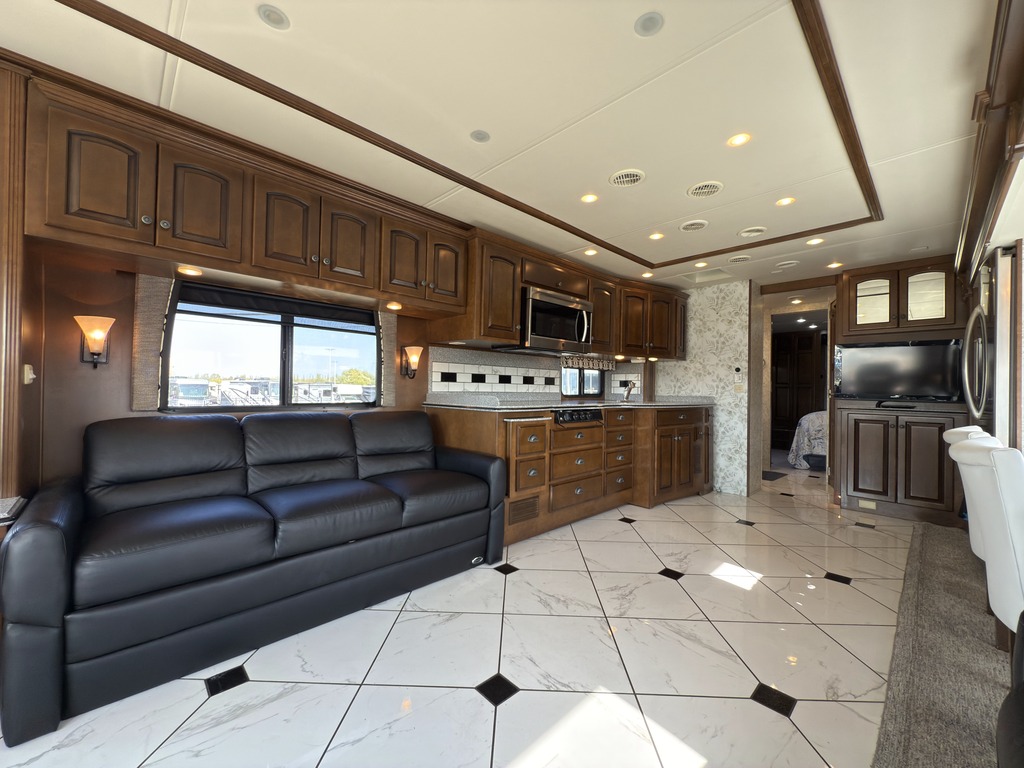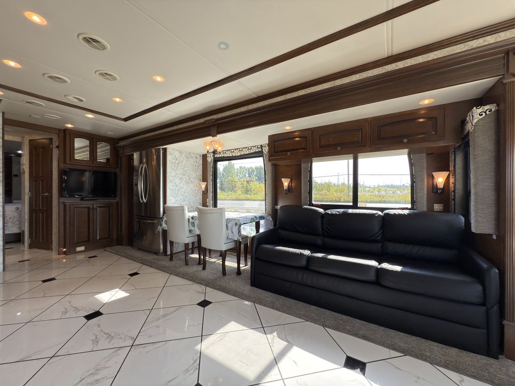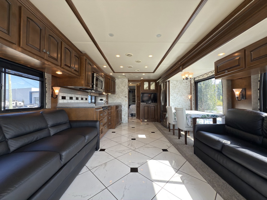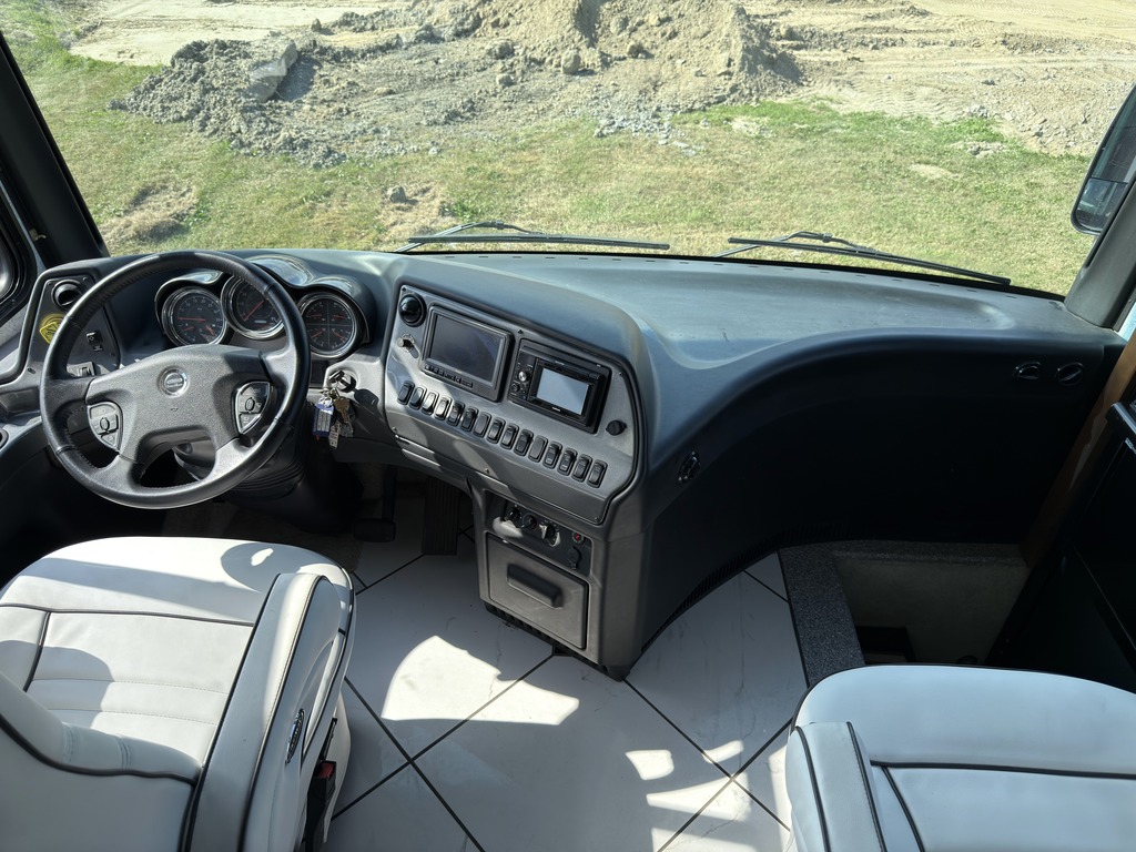 Options : Suspension pneumatique, Génératrice au diesel, Réservoir de propane, Climatiseur conduit central, Sièges électriques, Miroirs électriques, Régulateur de vitesse, Volant inclinable, Caméra Marche arrière, Cric hydraulique, Échelle, Attache-remorque, Douche, Toilette, Laveuse, Sécheuse, Lit arrière, Canapé-lit, Téléviseur, Antenne pour téléviseur, Micro-onde, Cuisinière, Auvent, Chauffe-eau