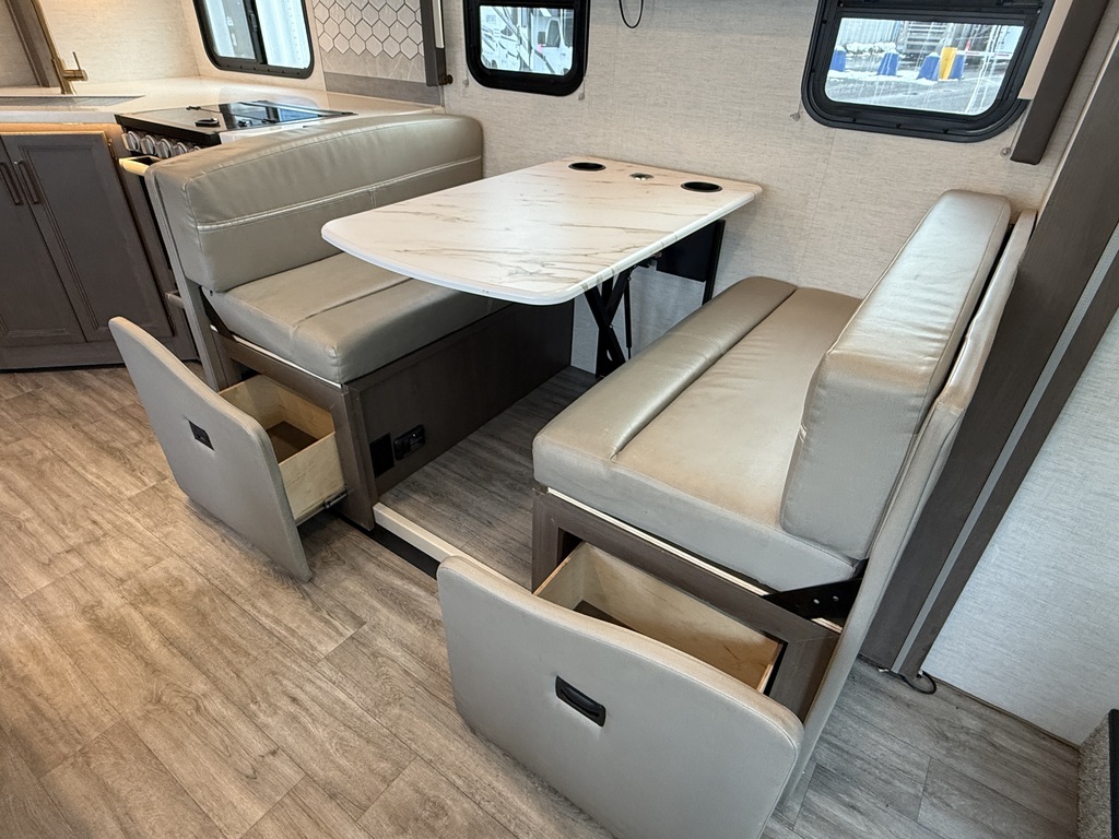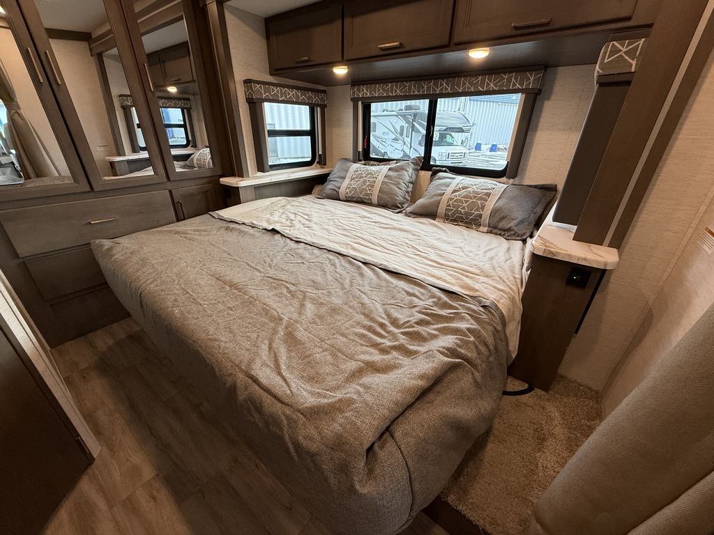 Options : Jantes aluminium, Génératrice à essence, Réservoir de propane, Climatiseur au tableau de bord, Climatiseur conduit central, Vitres électriques, Miroirs électriques, Régulateur de vitesse, Volant inclinable, Caméra Marche arrière, Cric hydraulique, Douche extérieure, Échelle, Attache-remorque, Douche, Toilette, Prise électrique, Détecteur LPG/CO2, Téléviseur, Micro-onde, Cuisinière, Four, Hotte, Fourneau, Auvent, Chauffe-eau