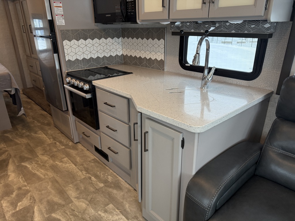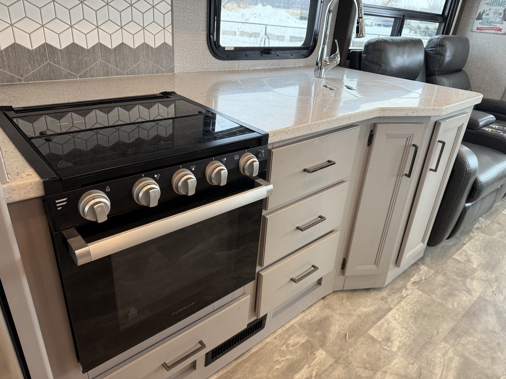 Options : Jantes aluminium, Génératrice à essence, Réservoir de propane, Climatiseur au plafond, Climatiseur au tableau de bord, Climatiseur conduit central, Régulateur de vitesse, Volant inclinable, Cric hydraulique, Échelle, Attache-remorque, Douche, Toilette, Lit queen-size, Prise électrique, Téléviseur, Micro-onde, Cuisinière, Four, Hotte, Fourneau, Auvent, Chauffe-eau