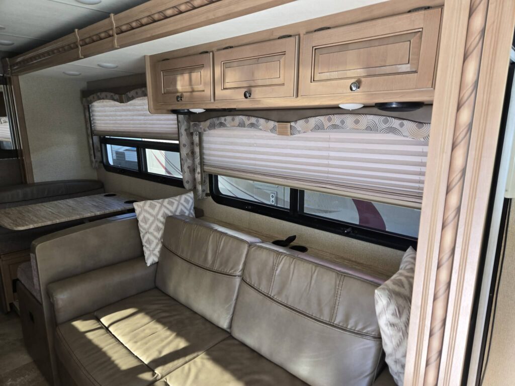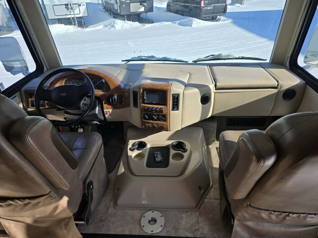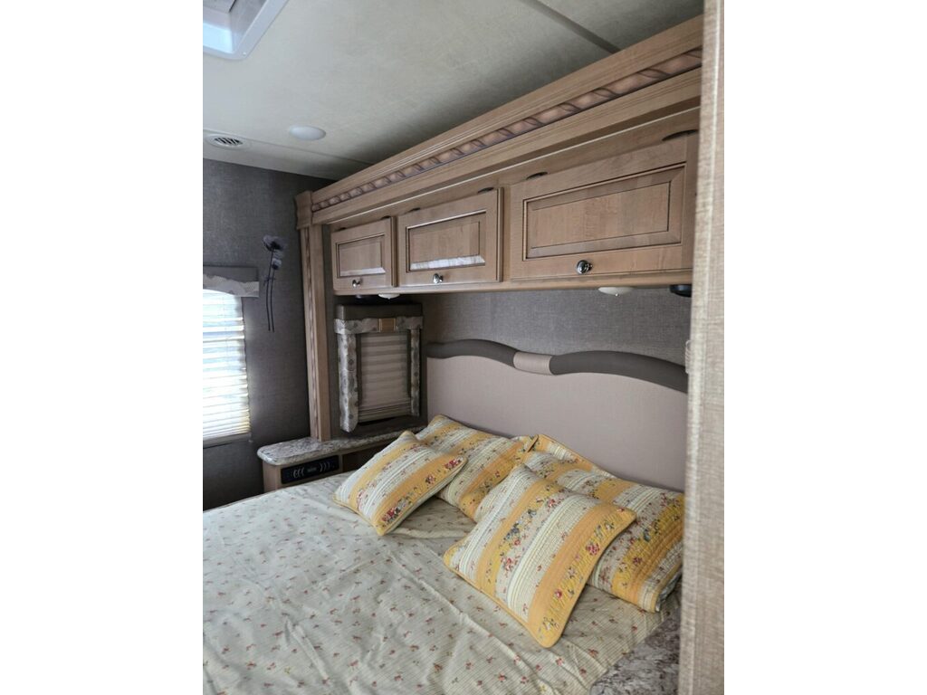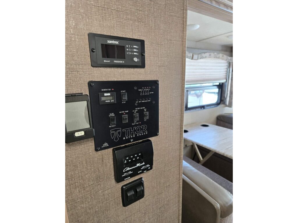Options : Génératrice à essence, Réservoir de propane, Climatiseur au plafond, Climatiseur conduit central, Miroirs électriques, Régulateur de vitesse, Volant inclinable, Caméra Marche arrière, Douche extérieure, Attache-remorque, Douche, Toilette, Lit queen-size, Détecteur LPG/CO2, Chaine stéréo, Prise cable, Antenne pour téléviseur, Micro-onde, Cuisinière, Hotte, Auvent, Chauffe-eau, Couchette