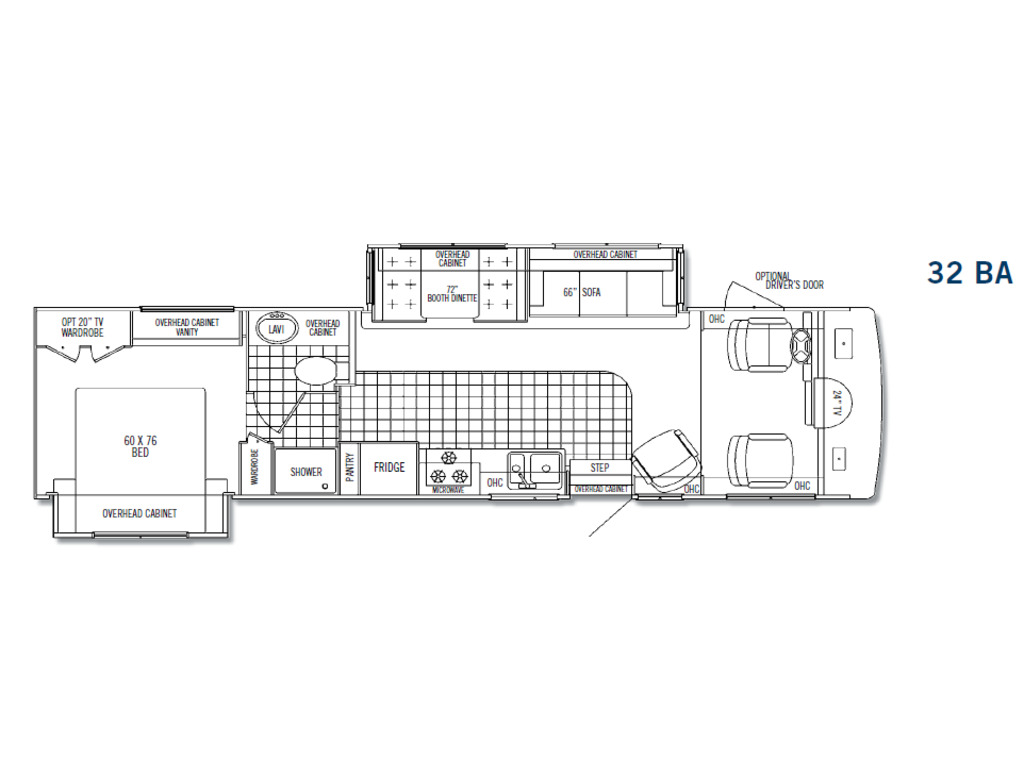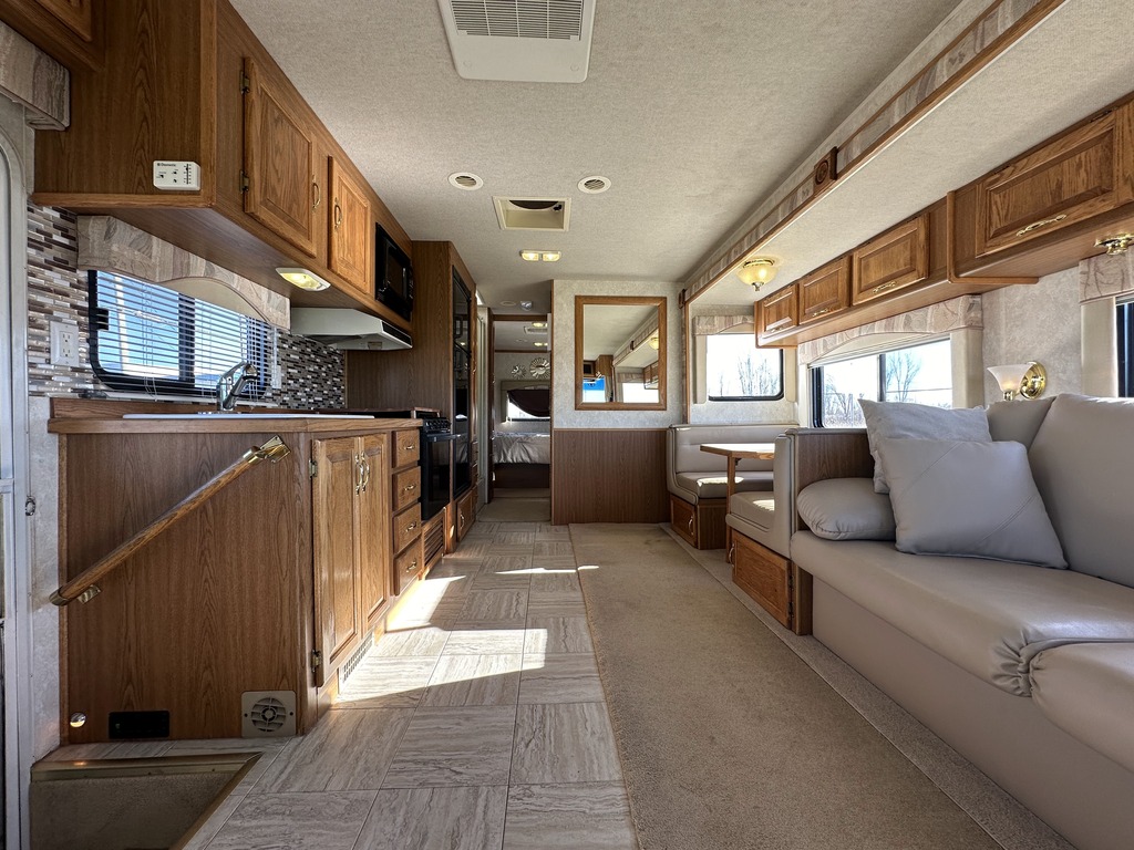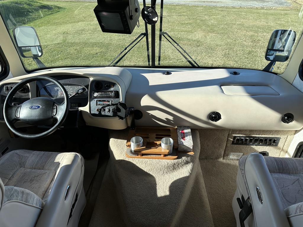 Options : Génératrice à essence, Réservoir de propane, Climatiseur conduit central, Miroirs électriques, Régulateur de vitesse, Volant inclinable, Caméra Marche arrière, Échelle, Attache-remorque, Douche, Toilette, Lit queen-size, Canapé-lit, Prise électrique, Téléviseur, Antenne pour téléviseur, Micro-onde, Cuisinière, Four, Hotte, Fourneau, Auvent, Chauffe-eau