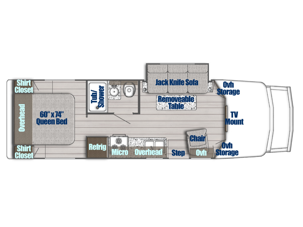 Options : Génératrice à essence, Réservoir de propane, Climatiseur conduit central, Vitres électriques, Miroirs électriques, Régulateur de vitesse, Volant inclinable, Caméra Marche arrière, Cric hydraulique, Échelle, Attache-remorque, Douche, Toilette, Lit queen-size, Prise électrique, Antenne pour téléviseur, Micro-onde, Cuisinière, Four, Hotte, Fourneau, Auvent, Chauffe-eau