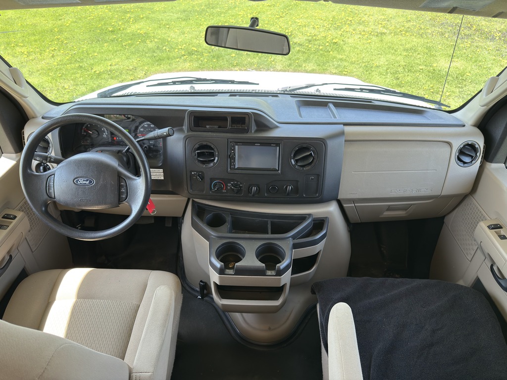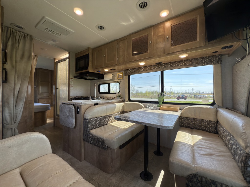 Options : Suspension pneumatique, Génératrice à essence, Réservoir de propane, Climatiseur conduit central, Vitres électriques, Miroirs électriques, Régulateur de vitesse, Volant inclinable, Caméra Marche arrière, Échelle, Attache-remorque, Douche, Toilette, Lit queen-size, Prise électrique, Téléviseur, Antenne pour téléviseur, Micro-onde, Cuisinière, Four, Hotte, Fourneau, Auvent, Chauffe-eau