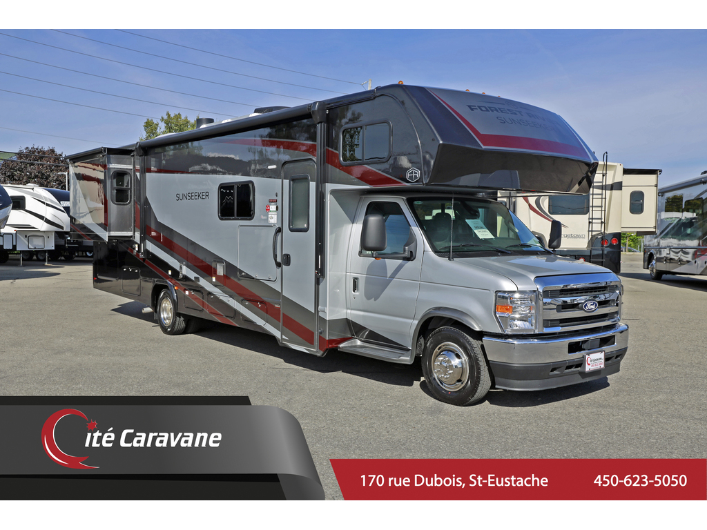 Forest River Sunseeker 3010 2 extension CLASSE C Pacific crimson , ***CRICS HYDRAULICS*** Interieur : dove grey + boiserie : River teak Ford 7.3L V8, Prise 30AMP , chauffe eau 6 gallons , chauffage 30,000BTU , A/C au toit 13.5BTU canalisé , ballons a air ride rite , murs de 2, fini gel-coat , toit en fibre de verre , auvent électrique , hitch de 7500lbs ,TV , frigidaire 10 pieds cube , tiroirs styles résidentiels , cuisinière a trois bruleur , stores de nuit , plafond de 7 pieds , génératrice de 4000watts onan, 2 batteries auxiliaires , , micro-onde , sièges avant en cuirette appareils en stainless , arctic Pack ( 4 saisons ), couvert en fibre de verre , matelas Queen , Prélart a grandeur Beauflor , antenne digitale, comptoirs de luxe, *PREMIUM CAMPING PACKAGE (mirroirs chauffants/électrique, caméra de recule et latérales, cinema maison 5.1 , black tank flush) + panneau solaire Finacement facile sur place ! www.citecaravane.com 450-623-5050 170 RUE DUBOIS , ST-EUSTACHE, SUR LE BORD DE LA 640! UNE ENTREPRISE FAMILIALE A VOTRE SERVICE DEPUIS 1973 ! , DÉPOSITAIRE NUMÉRO 1 FOREST RIVER SUNSEEKER ! LE SPÉCIALISTE DU VR AU QUÉBEC ! Forest River Sunseeker 3010 2 slide CLASS C crimson full paint interior : dove grey+ cabinets : river teak ***HYDRAULIC JACKS ** Ford 7.3L V8 , 30AMP , 6 gallon water heater , 30,000BTU heater , 13.5BTU ducted roof A/C , ride rite air suspension , 2inch thick walls , gel-coat exterior , fiberglass roof , electric awning , 7500lbs hitch , TV , 10 cubic feet fridge , residential style drawers , 3 range burner oven , micro-wave , night shades , 7 feet high ceilings , 4000watts Onan generator, 2 auxiliary batteries, leatherette front seats , stainless steel appliances , arctic pack ( 4 seasons ) fiberglass front cap , Queen matress , Beauflor linoleum throughout , Digital Antenna ,Upgraded countertops,*PREMIUM CAMPING PACKAGE (heated/electric mirrors,back up and side cameras, 5.1 surround sound,black tank flush)+ Solar Panel . Financement facile sur place www.citecaravane.com 450-623-5050 ! CALL US TODAY ! Cité Caravane, 170 rue Dubois in Saint-Eustache, adjacent to the 640 highway. A FAMILY OWNED BUISNESS SINCE 1973 ! QUÉBEC s RV SPECIALIST ! *photo a titre indicatif * not actual pictures of unit but similar *