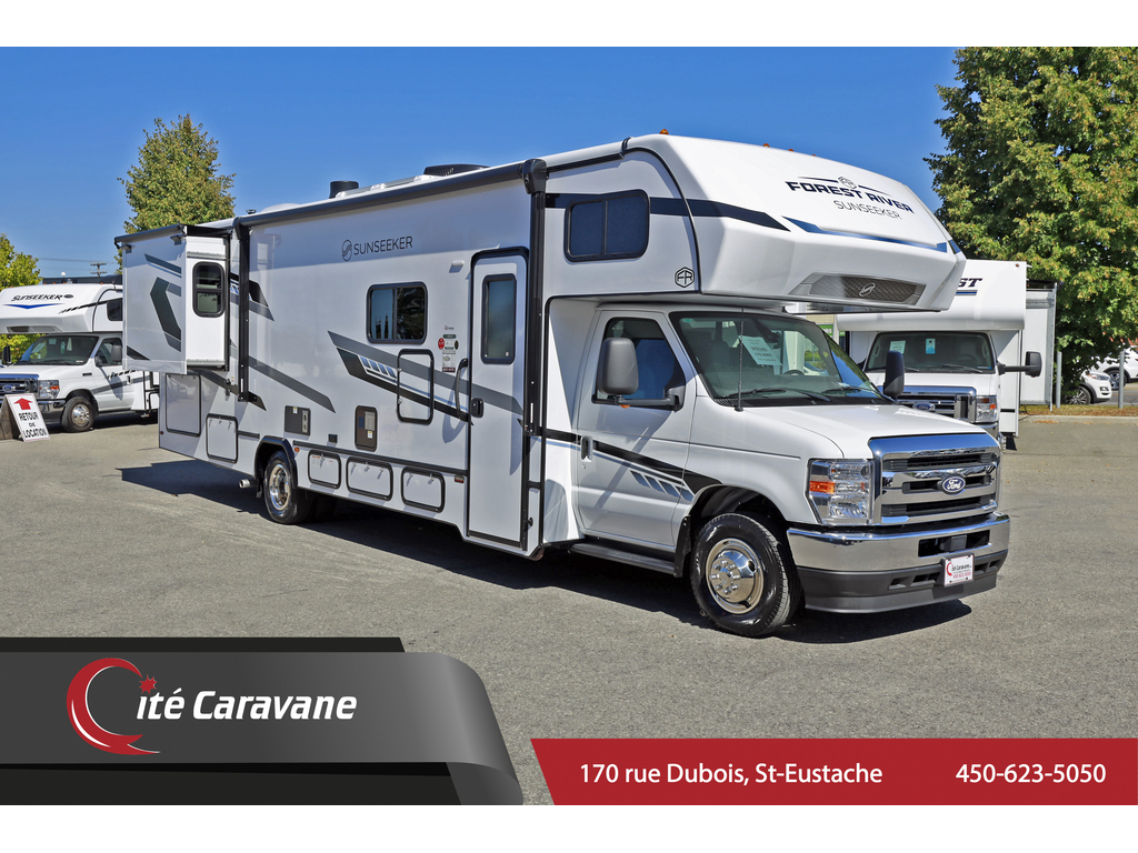 Forest River Sunseeker 3010 2 extension CLASSE C 31 pieds + crics hydraulics Interieur : Lava + boiserie : river teak Ford 7.3L V8, Prise 30AMP , chauffe eau 6 gallons , chauffage 30,000BTU , A/C au toit 13.5BTU canalisé , ballons a air ride rite , murs de 2, fini gel-coat , toit en fibre de verre , auvent électrique , hitch de 7500lbs ,TV , frigidaire 10 pieds cube , tiroirs styles résidentiels , cuisinière a trois bruleur , stores de nuit , plafond de 7 pieds , génératrice de 4000watts onan, 2 batteries auxiliaires ,, micro-onde , sièges avant en cuirette appareils en stainless , arctic Pack ( 4 saisons ), couvert en fibre de verre , matelas Queen , Prélart a grandeur Beauflor , antenne digitale, comptoirs de luxe, *PREMIUM CAMPING PACKAGE (mirroirs chauffants/électrique, caméra de recule et latérales, cinema maison 5.1 , black tank flush) + panneau solaire Finacement facile sur place ! www.citecaravane.com 450-623-5050 170 RUE DUBOIS , ST-EUSTACHE, SUR LE BORD DE LA 640! UNE ENTREPRISE FAMILIALE A VOTRE SERVICE DEPUIS 1973 ! , DÉPOSITAIRE NUMÉRO 1 FOREST RIVER SUNSEEKER ! LE SPÉCIALISTE DU VR AU QUÉBEC ! Forest River Sunseeker 3010 2 slide CLASS C 31 feet interior : Lava + cabinets : river teak Ford 7.3L V8 , 30AMP , 6 gallon water heater , 30,000BTU heater , 13.5BTU ducted roof A/C , ride rite air suspension , 2inch thick walls , gel-coat exterior , fiberglass roof , electric awning , 7500lbs hitch , TV , 10 cubic feet fridge , residential style drawers , 3 range burner oven , micro-wave , night shades , 7 feet high ceilings , 4000watts Onan generator, 2 auxiliary batteries , leatherette front seats , stainless steel appliances , arctic pack ( 4 seasons ) fiberglass front cap , Queen matress , Beauflor linoleum throughout , Digital Antenna ,Upgraded countertops,*PREMIUM CAMPING PACKAGE (heated/electric mirrors,back up and side cameras, 5.1 surround sound,black tank flush)+ Solar Panel . Financement facile sur place www.citecaravane.com 450-623-5050 ! CALL US TODAY ! Cité Caravane, 170 rue Dubois in Saint-Eustache, adjacent to the 640 highway. A FAMILY OWNED BUISNESS SINCE 1973 ! QUÉBEC s RV SPECIALIST !