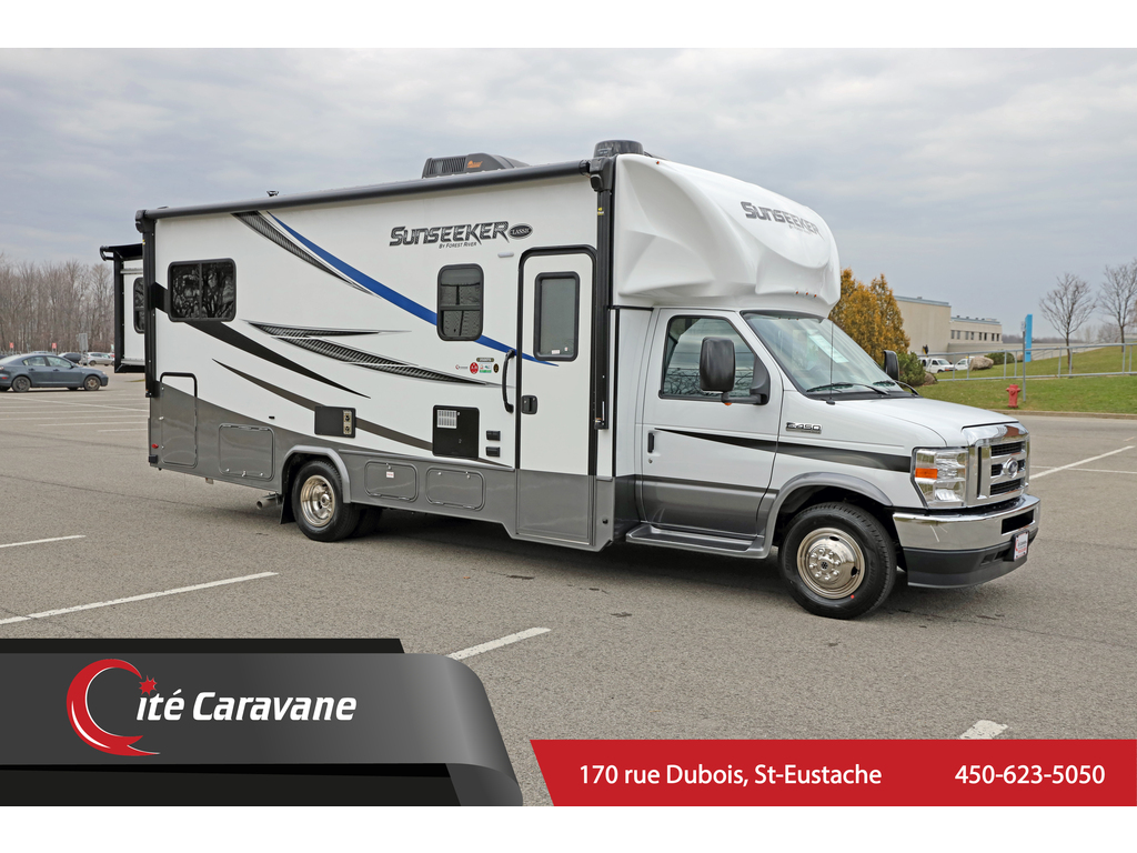 Disponible sur commande - Available on order Forest River Sunseeker 2500 3 extensions CLASSE C / B+ Skirt paint, Tissu : Slate , boiseries : Vermont oak , Ford V8 7.3L , Prise 30AMP , chauffe-eau 6 gallons , chauffage 30,000BTU , A/C au toit 13.5BTU canalisé , ballons a air ride rite , murs de 2, fini gel-coat , toit en fibre de verre , auvent électrique , hitch de 7500lbs , lecteur AM/FM ,TV , frigidaire 10 pieds cube , tiroirs styles résidentiels , cuisinière a trois bruleur , stores de nuit , plafond de 7 pieds , génératrice de 4000watts onan, 2 batteries auxiliaires , micro-onde , sièges avant en cuirette appareils en stainless , arctic Pack ( 4 saisons ) , couvert en fibre de verre , lit queen, Prélart a grandeur Beauflor , antenne digitale, comptoirs de luxe, *PREMIUM CAMPING PACKAGE (mirroirs chauffants/électrique, caméra de recule et latérales, cinema maison 5.1 , black tank flush) + panneau solaire + crics hydraulic Financement facile sur place ! www.citecaravane.com 450-623-5050 170 RUE DUBOIS , ST-EUSTACHE, SUR LE BORD DE LA 640! UNE ENTREPRISE FAMILIALE A VOTRE SERVICE DEPUIS 1973 ! , DÉPOSITAIRE NUMÉRO 1 FOREST RIVER SUNSEEKER ! LE SPÉCIALISTE DU VR AU QUÉBEC ! Forest River Sunseeker 2500 3 slides CLASS C / B+ skirt paint, fabric : Slate , wood : Vermont Oak , Ford V-8 7.3L , 30AMP , 6 gallon water heater , 30,000BTU heater , 13.5BTU ducted roof A/C , ride rite air suspension , 2inch thick walls , gel-coat exterior , fiberglass roof , electric awning , 7500lbs hitch , AM/FM, TV , 10 cubic feet fridge , residential style drawers , 3 range burner oven , micro-wave , night shades , 7 feet high ceilings , 4000watts Onan generator, 2 auxiliary batteries, spare tire , leatherette front seats , stainless steel appliances , arctic pack ( 4 seasons ) , fiberglass front cap , Queen size bed , Beauflor linoleum throughout , Digital Antenna ,Upgraded countertops,*PREMIUM CAMPING PACKAGE (heated/electric mirrors,back up and side cameras, 5.1 surround sound,black tank flush)+ Solar Panel .+ hydraulic jacks Financement facile sur place ! s. www.citecaravane.com 450-623-5050 ! CALL US TODAY ! Cité Caravane, 170 rue Dubois in Saint-Eustache, adjacent to the 640 highway. A FAMILY OWNED BUISNESS SINCE 1973 ! QUÉBEC s RV SPECIALIST !