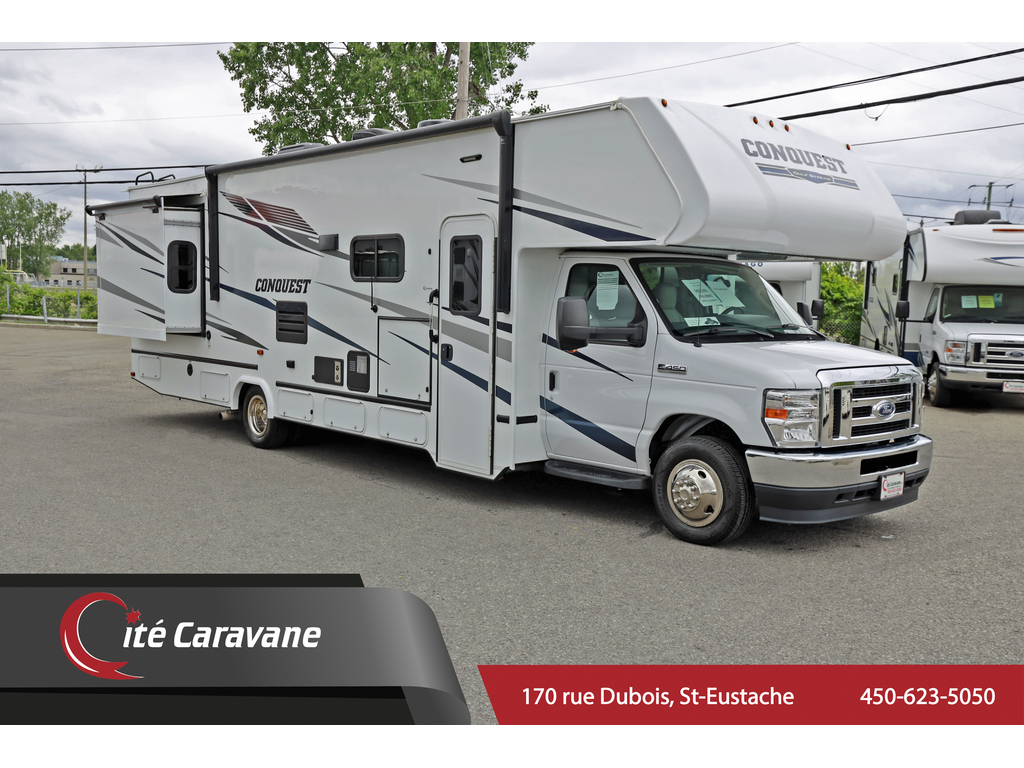 LIQUIDATION 109 900$ !! PRIX reg 125 900$ !! Classe C Gulfstream Conquest 6320 2 extension! Mécanique Ford V-8 7.3L ! Caméra arrière, murs finis gel coat, auvent électrique, génératrice 4000 watts Onan, échelle arrière, cable 30 ampères, coffres roto-moulés, attache-remorque de 5000 lbs, toiture en TPO dune seule pièce, batterie auxiliaire etc.. Réfrigérateur 8pi cube, évier en stainless avec couvert, micro-onde , hotte de poele , antenne analogique, dinette en cuirette, rangement sous la dinette, lit queen dans la chambre, garde-robe, douche, réservoir d'eau chaude propane , lit au-dessus de la cabine, revêtement de plancher en linoleum,air climatisé de 13,500 BTU canalisée, chauffage de 30,000 BTU au propane, lumières DEL, rideaux intimités etc. www.citecaravane.com 450-623-5050 ! Une entreprise familiale a votre service depuis 1973 ! 170 Rue Dubois St-eustache Classe C Gulfstream Conquest 6320 , 2 slide outs ! Ford V-8 7.3L! Rear camera gel coat finished walls, electric awning, 4000 watt Onan generator, rear ladder, 30 amp cable, roto-molded trunks, 5000 lbs trailer hitch, one piece TPO roof, auxiliary batterie etc. 8 ft cube fridge, stainless sink, microwave, stove hood, analog antenna, leatherette dinette, storage under the dinette, queen bed in bedroom, wardrobe, shower, hot water tank propane, bed above the cabin, linoleum floor covering, 13,500 BTU ducted air conditioning, 30,000 BTU propane heating, LED lights, privacy curtains, etc. www.citecaravane.com 450 -623-5050! A family business at your service since 1973! 170 Rue Dubois St-eustache