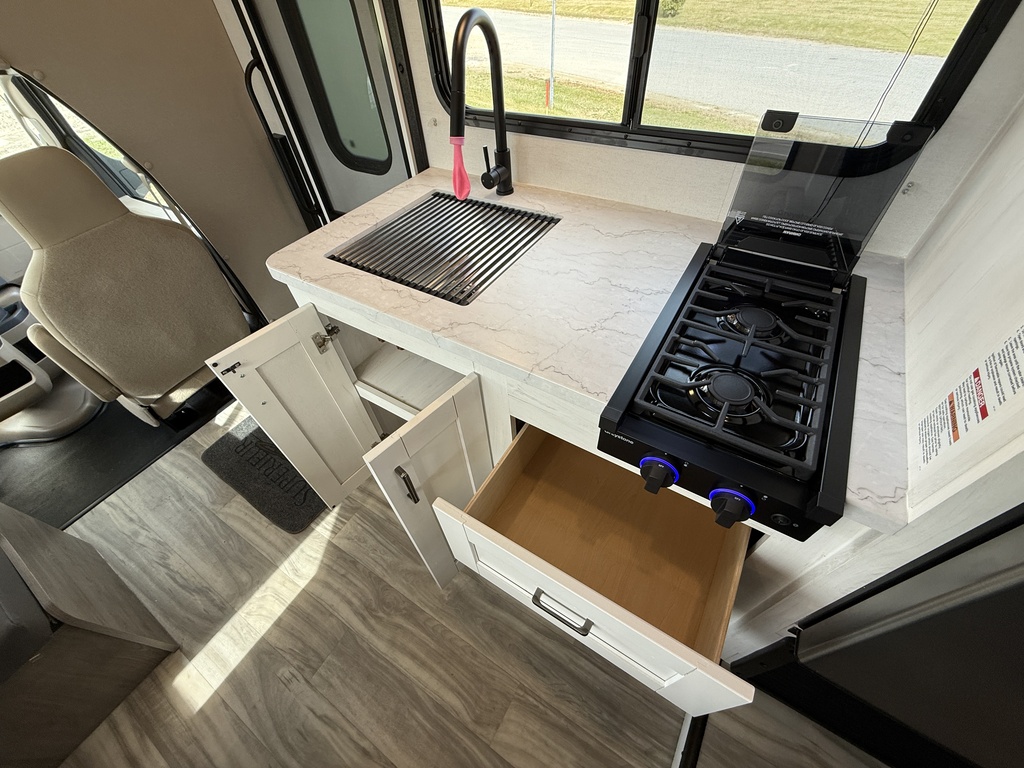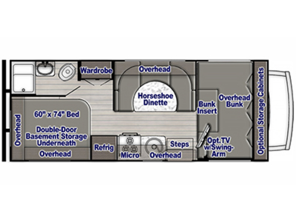 Options : Génératrice à essence, Convertisseur de courant continu, Réservoir de propane, Climatiseur conduit central, Vitres électriques, Miroirs électriques, Régulateur de vitesse, Volant inclinable, Douche extérieure, Attache-remorque, Douche, Toilette, Lit double, Prise électrique, Téléviseur, Micro-onde, Four, Hotte, Fourneau, Auvent, Chauffe-eau, Couchette