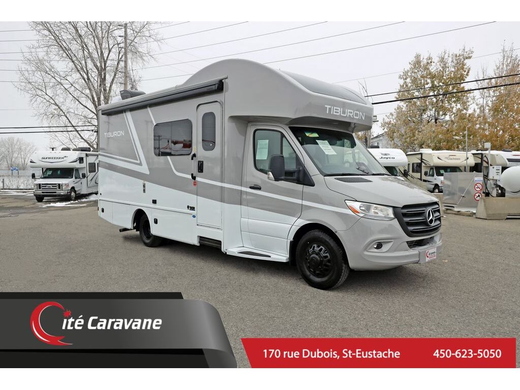 Thor Motor Coach Tiburon Mercedes Diesel Sprinter modèle 24TT + crics hydraulics Ce véhicule récréatif de luxe mesure environ 24 pieds 9 pouces de longueur et roule sur le châssis Mercedes Benz Sprinter sur chassis 4500 de premier ordre équipé d'un système d'assistance au freinage actif, d'une assistance à l'attention, d'une assistance de voie active, d'un système d'essuie-glace humide et d'un régulateur de distance Distronic Plus. Vous trouverez également des CRICS arriere, un chauffe-eau sans réservoir, Génératrice et les armoires ultra-hautes de gamme de TMC qui distinguent cet autocar de la concurrence! L'équipement en option comprend le magnifique extérieur peint pour tout le corps, la sangle de sécurité pour enfant unique et le toit AC. Le tout nouveau Tiburon Sprinter comprend également un attelage de 5000 lb, un capuchon avant en fibre de verre avec puits de lumière, un auvent de terrasse électrique sans bras avec éclairage à DEL intégré, des fenêtres sans cadre, une radio de tableau de bord multimédia avec Bluetooth, des rétroviseurs extérieurs chauffants et à distance, un système de secours, un pivot chaises capitaines, guides de tiroirs à roulement à billes métalliques pleine extension, Rapid Camp +et bien plus www.citecaravane.com 450-623-5050 170 rue dubois st-eustache J7P 4W9 Thor Motor Coach Tiburon Mercedes Diesel Sprinter Model 24TT + hydraulic jacks This Luxury RV measures approximately 24 feet 9 inches in length and rides on the premier Mercedes Benz Sprinter 4500 chassis equipped with an Active Braking Assist system, Attention Assist, Active Lane Assist, a Wet Wiper System and Distance Regulator Distronic Plus. You will also find rear jacks, a tank-less water heater, a generator and the ultra-high-line cabinetry from TMC that set this coach apart from the competition! Optional equipment includes the beautiful full-body paint exterior, single child safety tether & Roof A3C. The all new Tiburon Sprinter also features a 5,000 lb. hitch, fiberglass front cap with skylight, an armless power patio awning with integrated LED lighting, frameless windows, a multimedia dash radio with Bluetooth , heated & remote exterior mirrors, back up system, swivel captain chairs, full extension metal ball-bearing drawer guides, Rapid Camp+, and much more www.citecaravane.com 450-623-5050 170 rue dubois st-eustache J7P 4W9