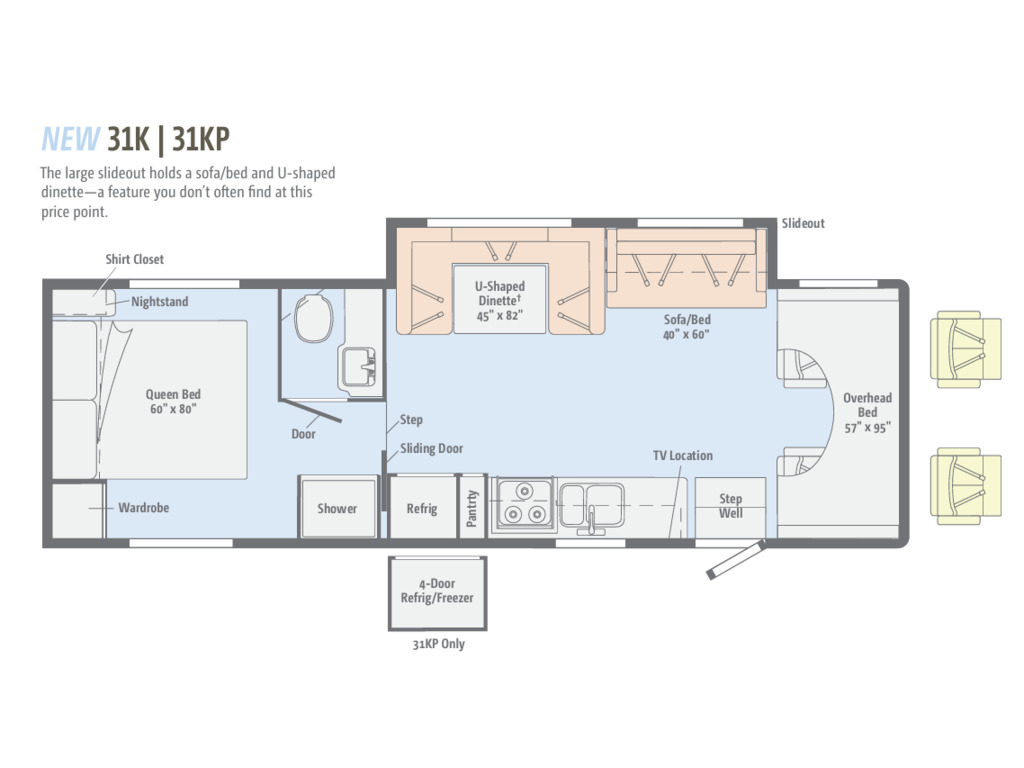 Options : Génératrice à essence, Réservoir de propane, Climatiseur conduit central, Vitres électriques, Miroirs électriques, Régulateur de vitesse, Volant inclinable, Échelle, Attache-remorque, Toilette, Lit queen-size, Prise électrique, Téléviseur, Antenne pour téléviseur, Micro-onde, Cuisinière, Hotte, Auvent, Chauffe-eau